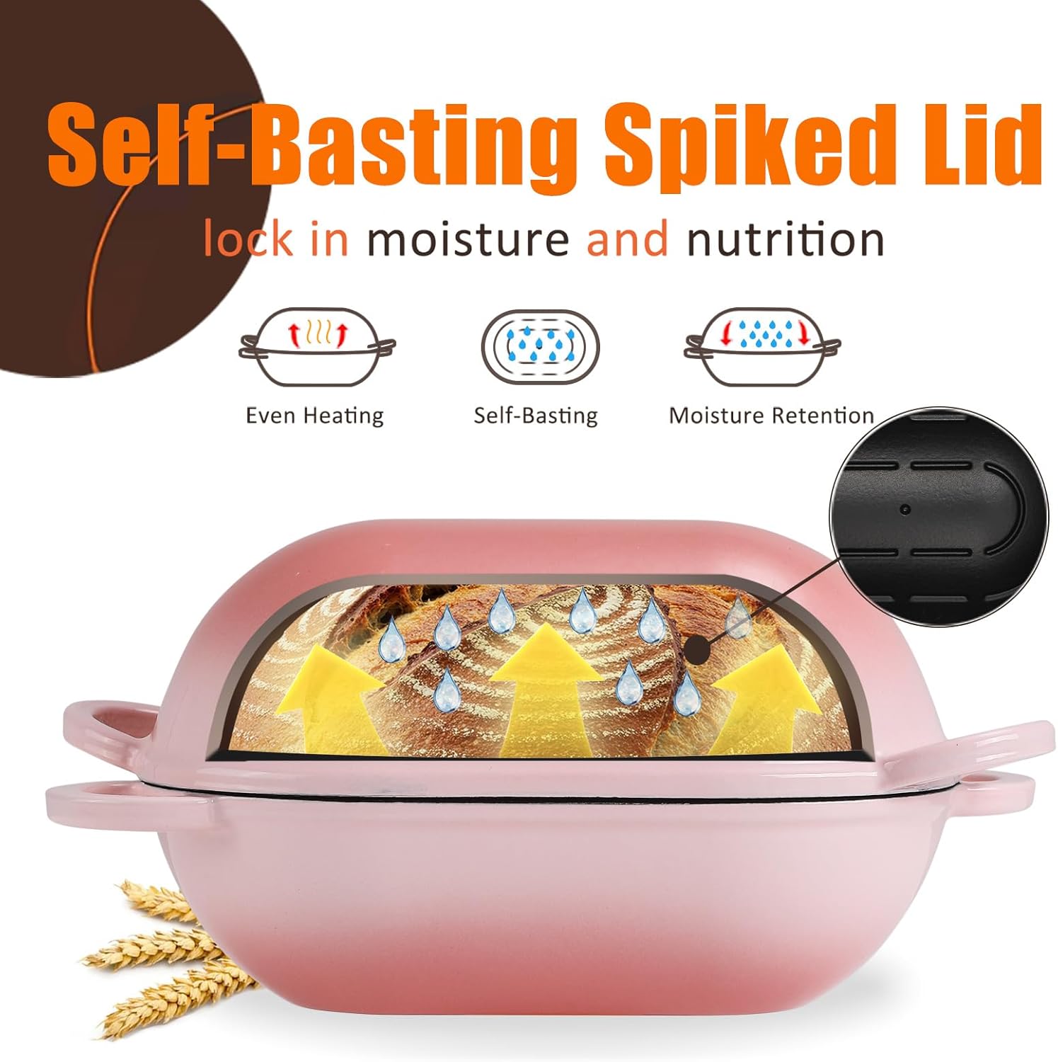 - Feature: The oval dome lid of this oval bread oven traps steam released during baking to produce a caramelized, crispy crust, preventing the crust from curdling, drying out or baking too quickly before rising. The ergonomic handles make lifting easy and comfortable