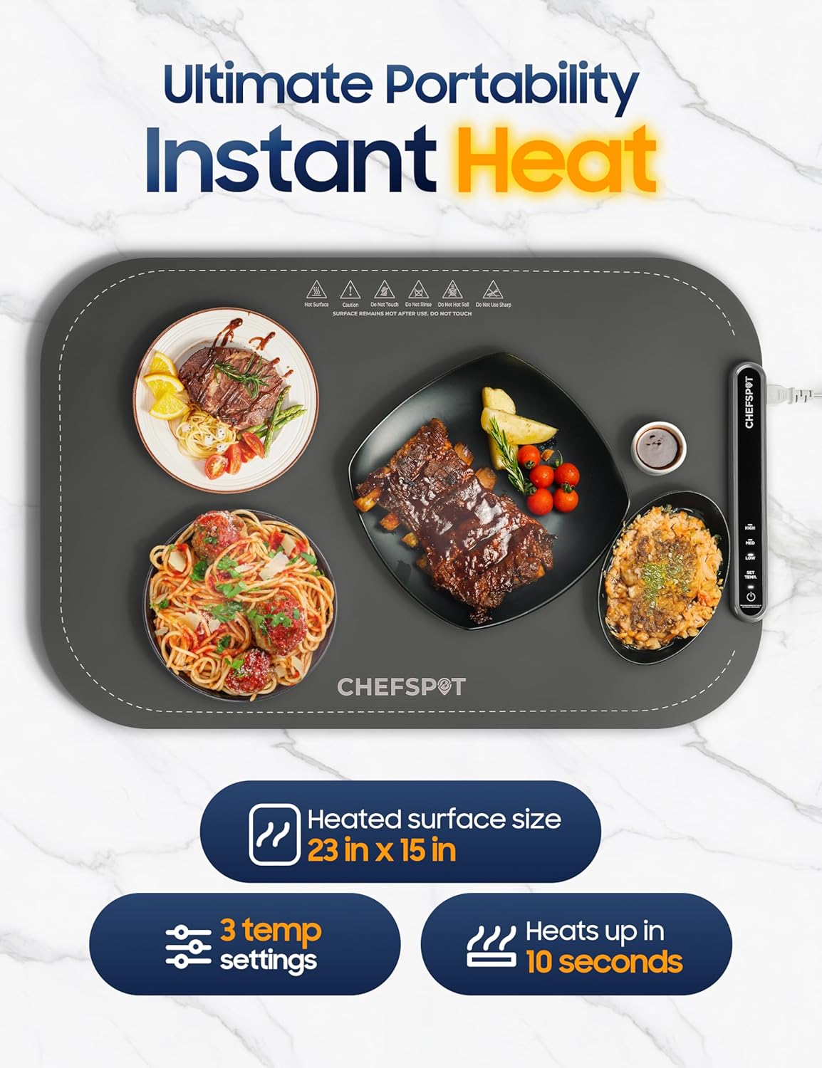 - Perfect for Buffets, Parties, and Everyday Meals: The CHEFSPOT warming mat offers a large 24" x 15" surface to keep multiple dishes warm at once. Whether you're hosting a family dinner, holiday gathering, or potluck, it's a compact and convenient alternative to bulky chafing dishes for buffets.