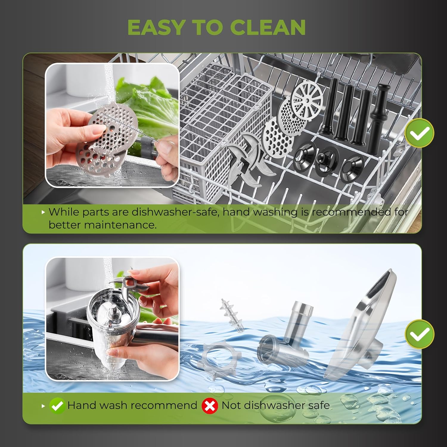 - Easy Cleaning, Hassle-Free Maintenance: Dishwasher-safe accessories (blades, plates, tubes) save cleanup time. Note: Aluminum head and tray require hand washing to prevent discoloration. The oil-resistant ABS housing wipes clean in seconds, and all parts are rust-proof for long-lasting hygiene