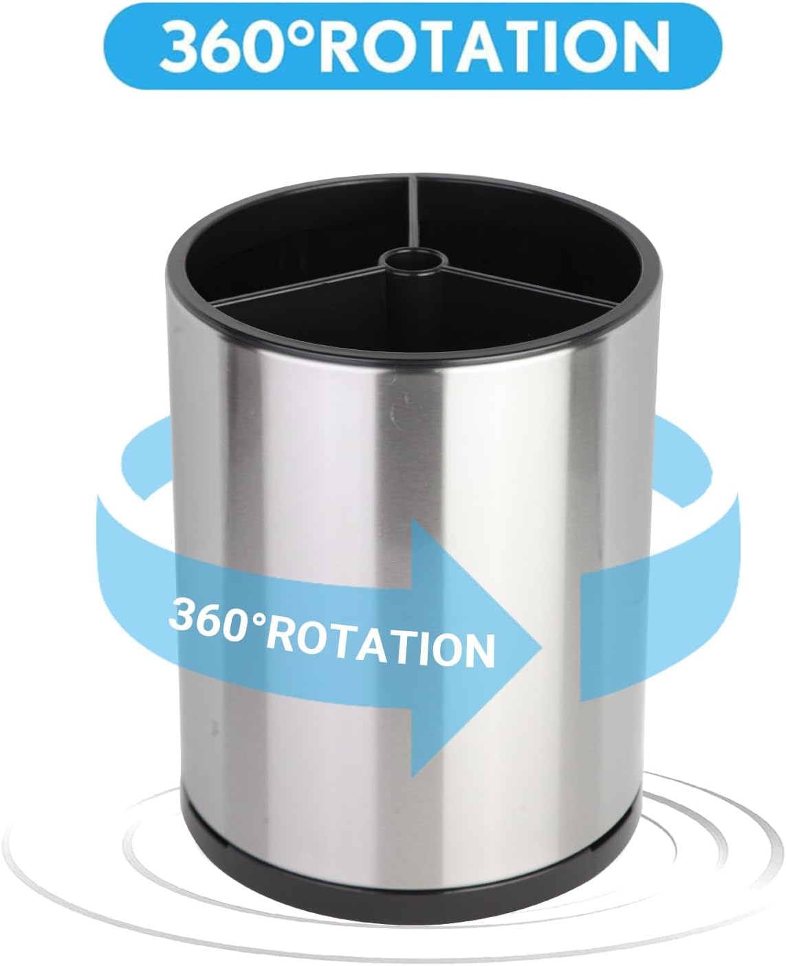 Kitchen Utensil Holder - 360° Rotating Stainless Steel Countertop Organizer (with Cleaning Brush) for Spoons, Spatulas & Cutlery Storage, Cooking Silverware Caddy with Removable Base, Silvery