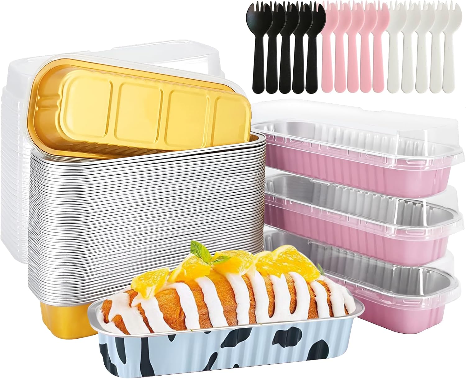 25 PCS Multiple colors Mini Loaf Pans with Lids and Spoons, 6.8oz Mini Cake Pans for Baking, Disposable Aluminum Foil Loaf Pans, Loaf Baking Pans for Party Individual Serving.