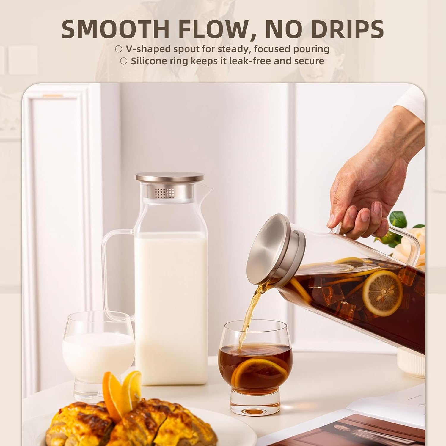 Glass Water Pitcher with Lid and Spout, 2L/68 Ounces Heat Resistant Borosilicate Glass Carafe, Temperature Safe