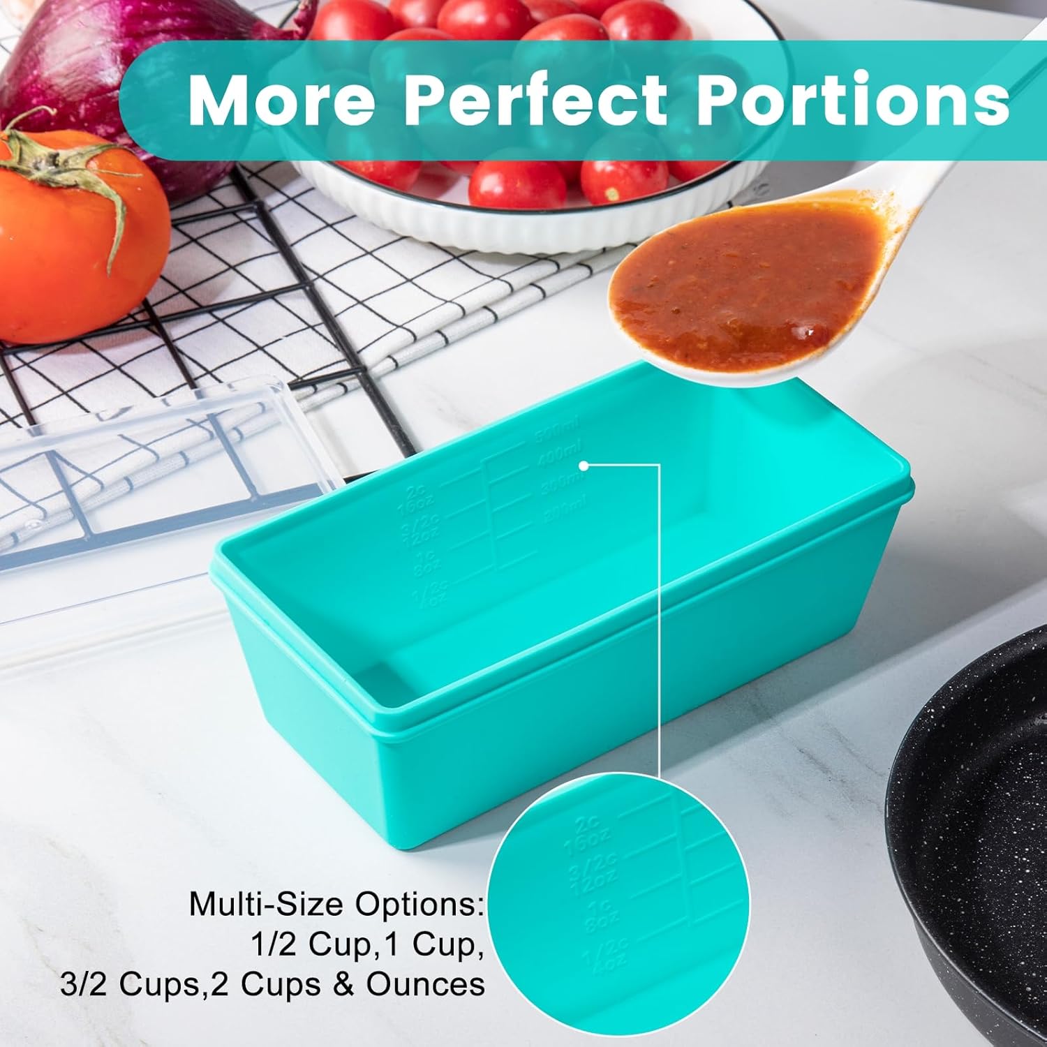 - Accurate Portion Control: Silicone freezer containers with measurement markings indicating capacities of 2-cup (500/250 mL, 16/8 oz), make portioning a breeze