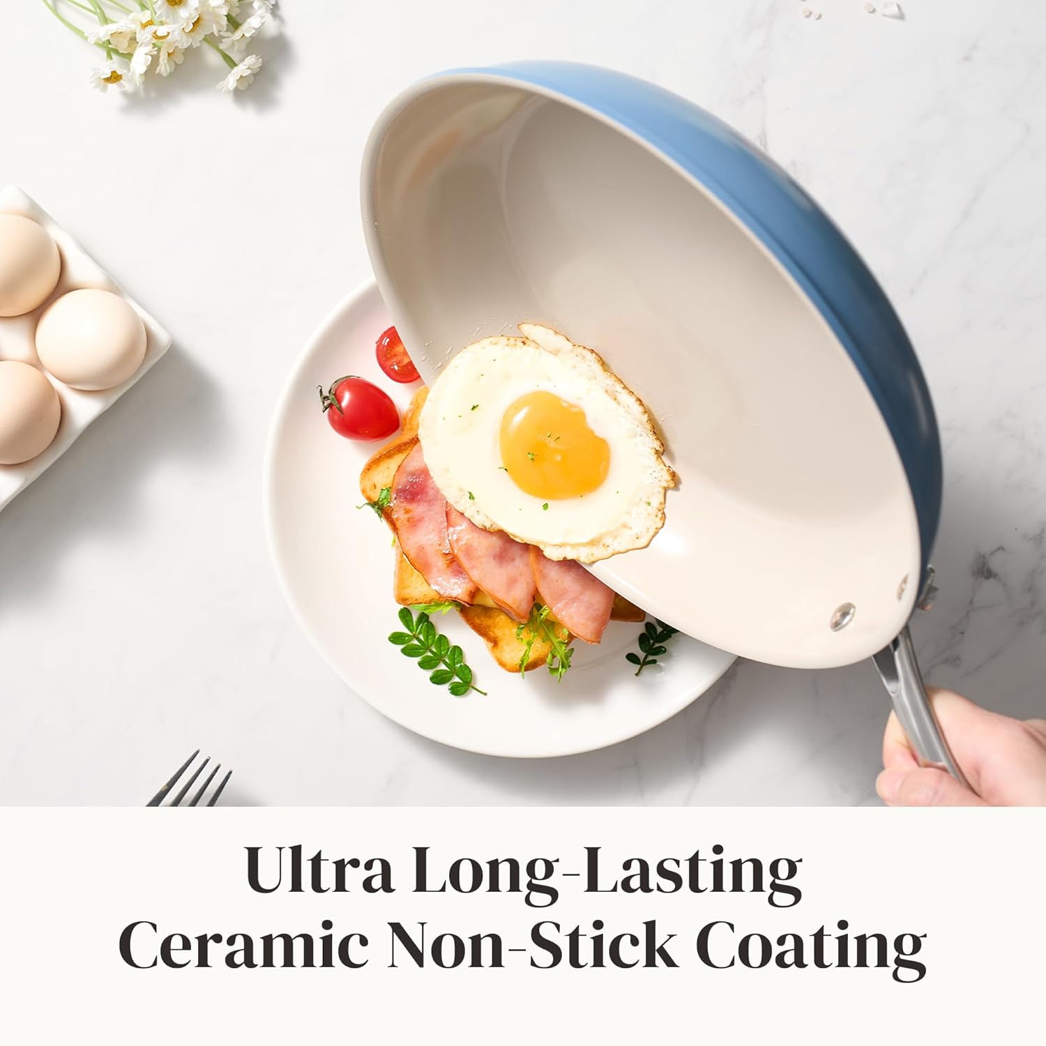 - COOL & STURDY HANDLE: Crafted from lightweight, precision-pressed stainless steel, this ergonomically designed handle ensures a comfortable grip. Double-riveted for exceptional strength and maneuverability, the ceramic skillet pan empowers you to seamlessly transition from stovetop to oven, allowing you to achieve that flawless sear, brown toppings, or even bake
