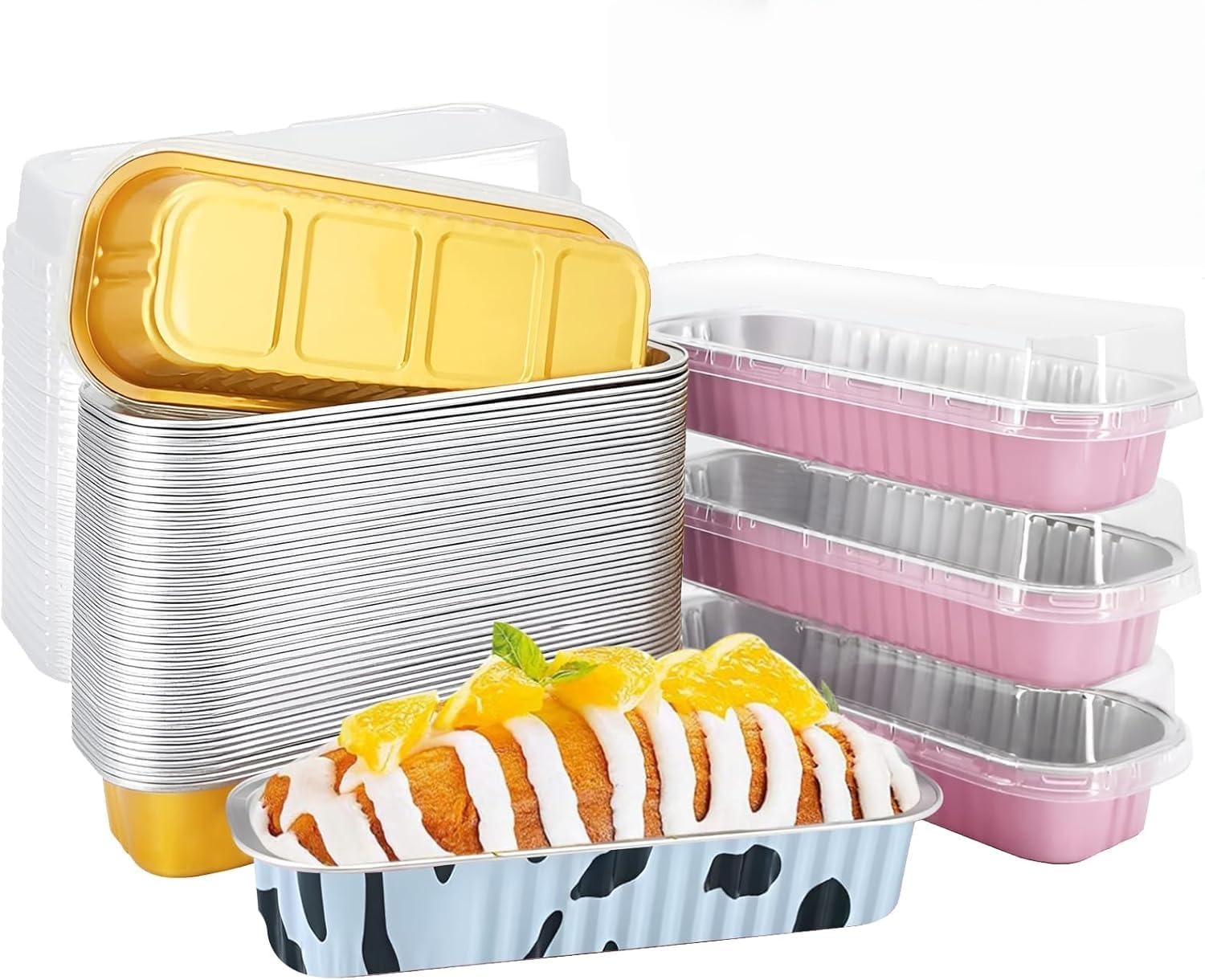 50 PCS Multiple colors Mini Loaf Pans with Lids, 6.8oz Cake Pans for Baking, Disposable Mini Aluminum Foil Loaf Pans, for Party Individual Serving.