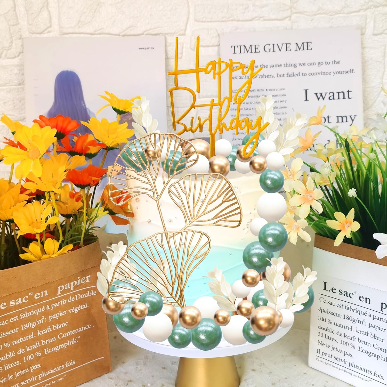 Gyufise 57Pcs Balls Cake Topper Boho Grass Cake topper Pearl Balls Acrylic Happy Birthday Cake Decorations for Wedding Baby Shower Birthday Boho Themed Party Supplies Pearl Green