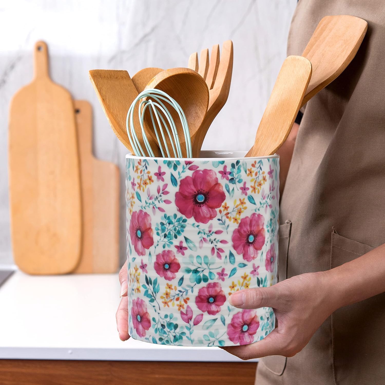 - Large and Deep Ceramic Utensil Holder Caddy.7.2″H*6.2″W inches, super large for larger and longer cooking utensils, keeping utensils handy and findable. A convenient solution for overflowing kitchen drawers and countertop clutter.