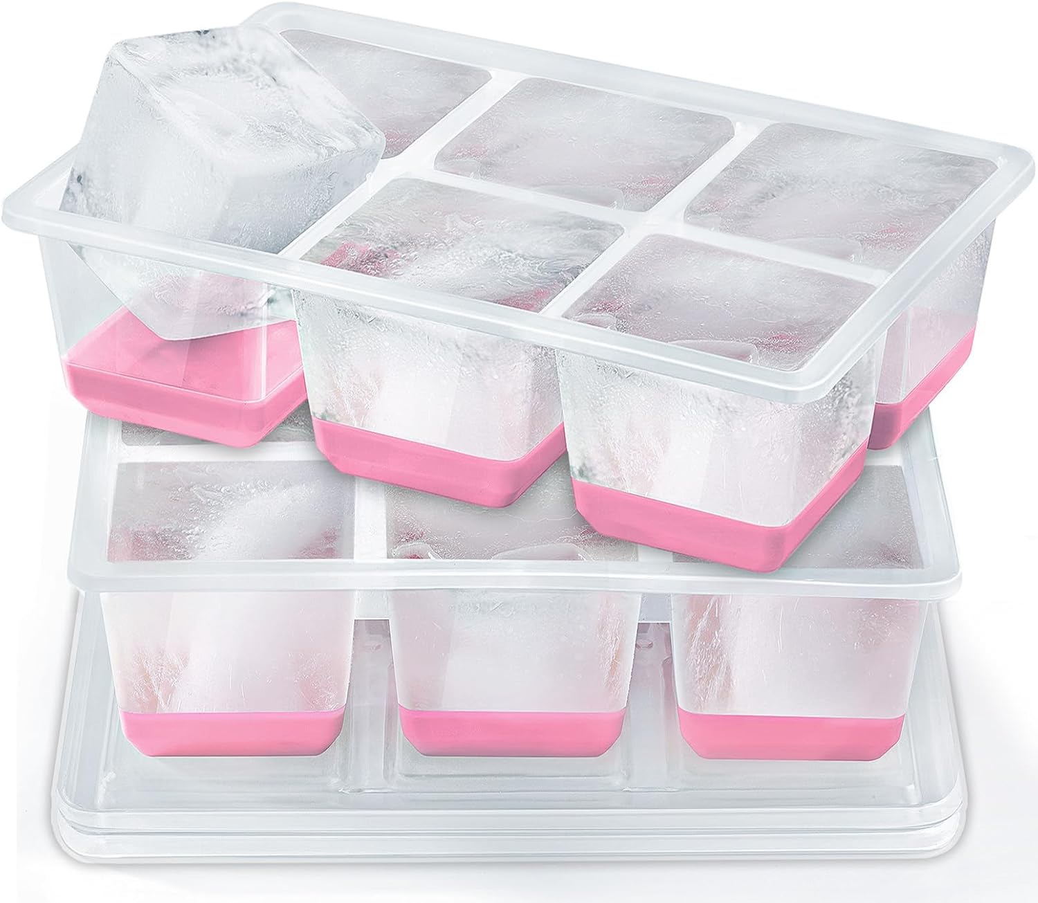 Ice Cube Trays 2 Pack, JRISBO Large Silicone Ice Cube Molds with Leak-Proof Lid, Transparent TPE Frame & Easy Release Bottom, Stackable Freezer Ice Trays for Whiskey, Cocktails, Soup, BPA Free