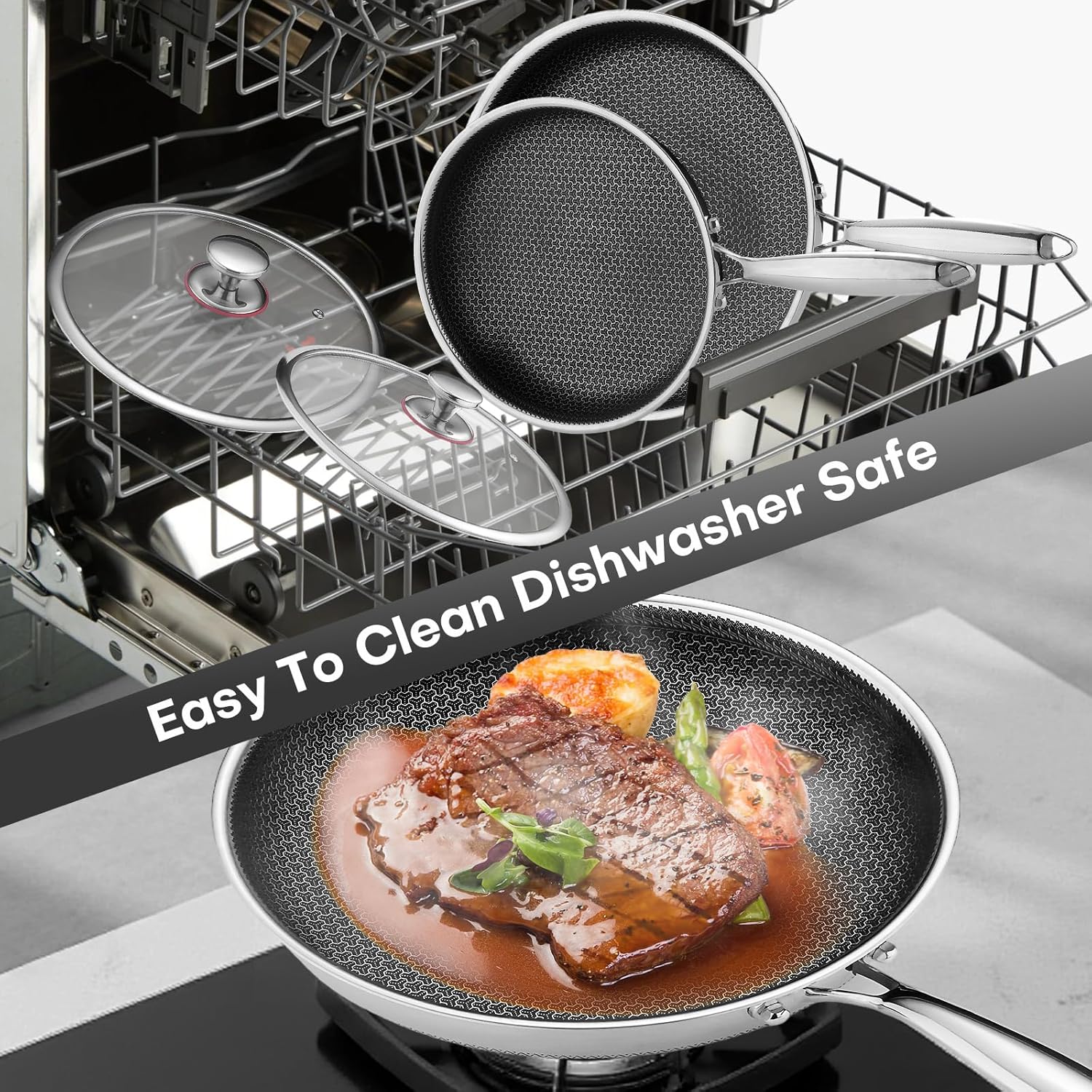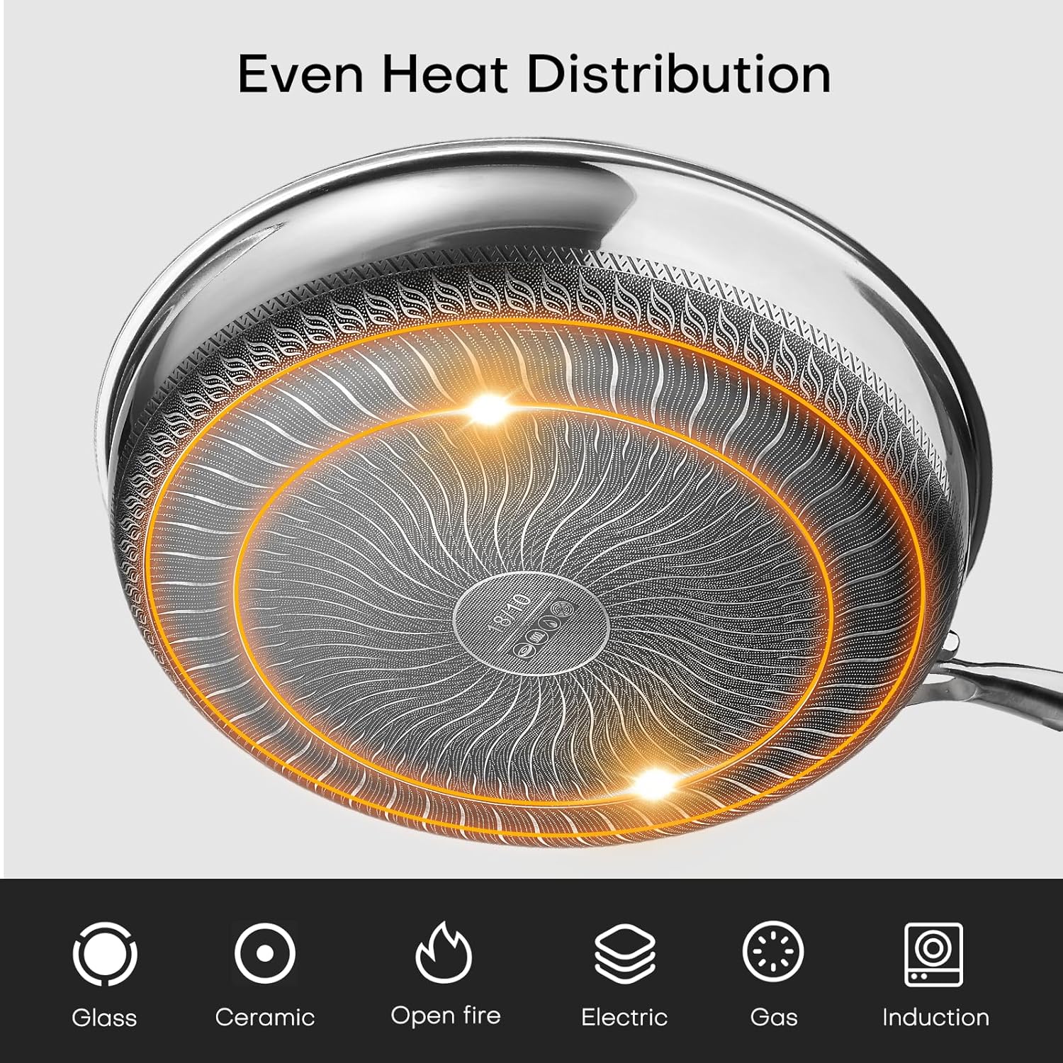 - Premium 18/10 Stainless Steel Construction – Non stick frying pans made with high-quality, coating and the nonstick surface design, durable 18/10 stainless steel for even heating, corrosion resistance, and easy to clean.