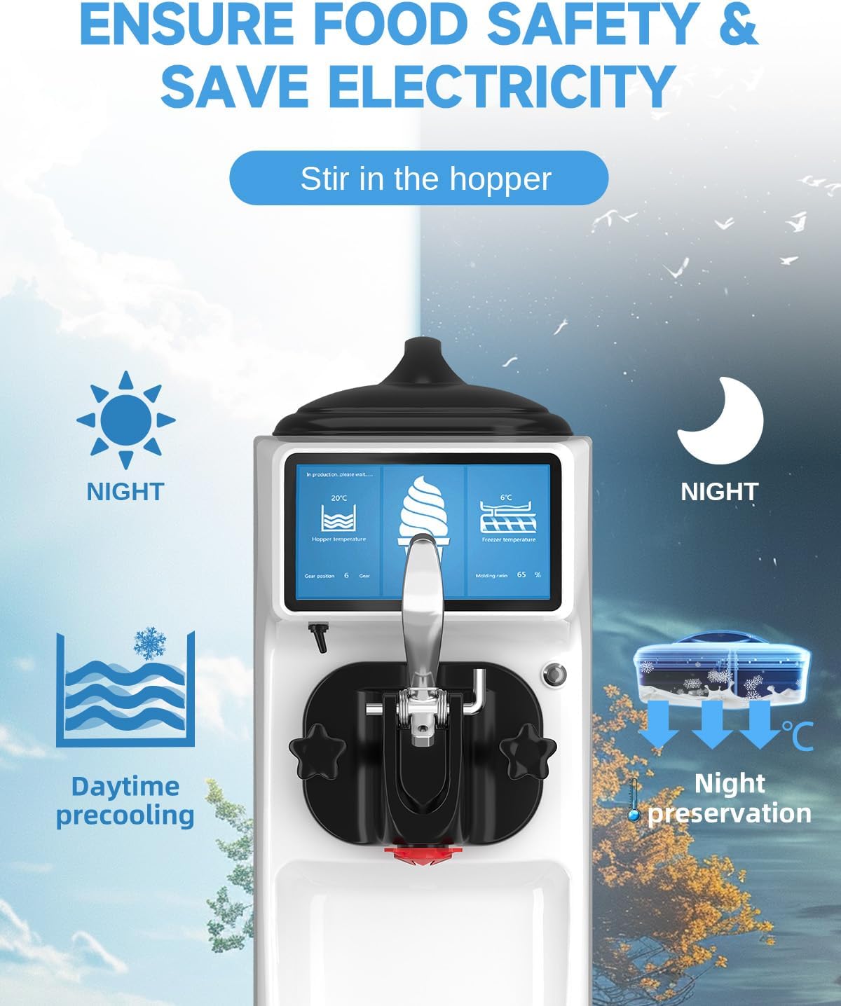 - Our ice cream machines adopt world-renowned brand compressors and worm gear reducers, equipped with R290 fluorine-free refrigerant, cooling faster, more energy-saving. The ice cream machine can adapt to a variety of different climates, (Working temperature: 41℉ ~ 91.4℉) the soft serve ice cream maker still works normally for small town restaurant, family vacation, chefs kitchen, business.