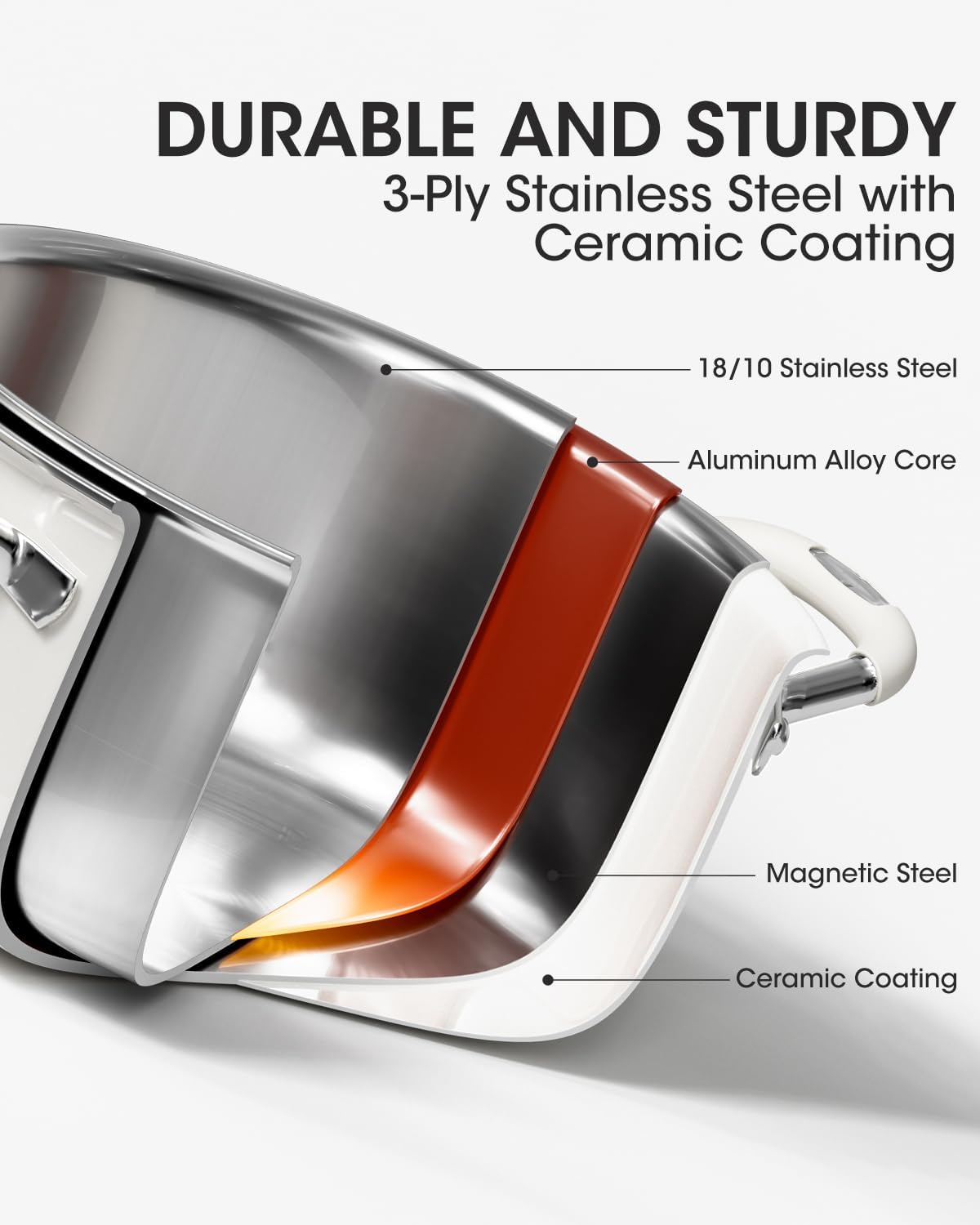 - Versatile & Durable Construction: Engineered to outperform standard pots, this soup pot with lid features a triple-layer construction (18/10 stainless steel, aluminum core, and magnetic base) for rapid heating on all stovetops. The thickened base prevents warping, whether you're simmering soups or braising food.