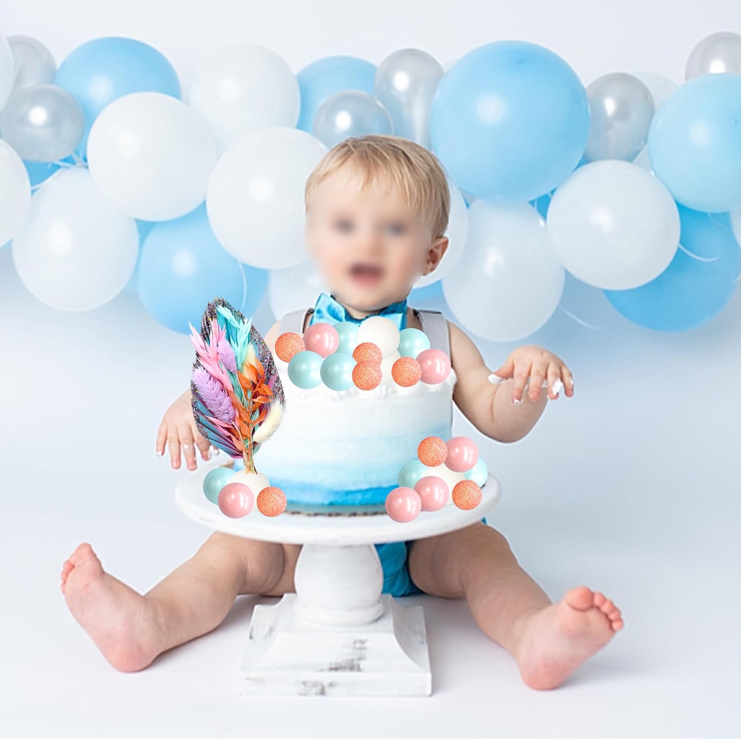 Gyufise 21 Pack Flower Boho Cake Topper Ball Cake Decorations Palm Leaves Plants Cake Decor for Girl Bohemian Princess Theme Wedding Baby Shower Birthday Party Supplies Pink Blue