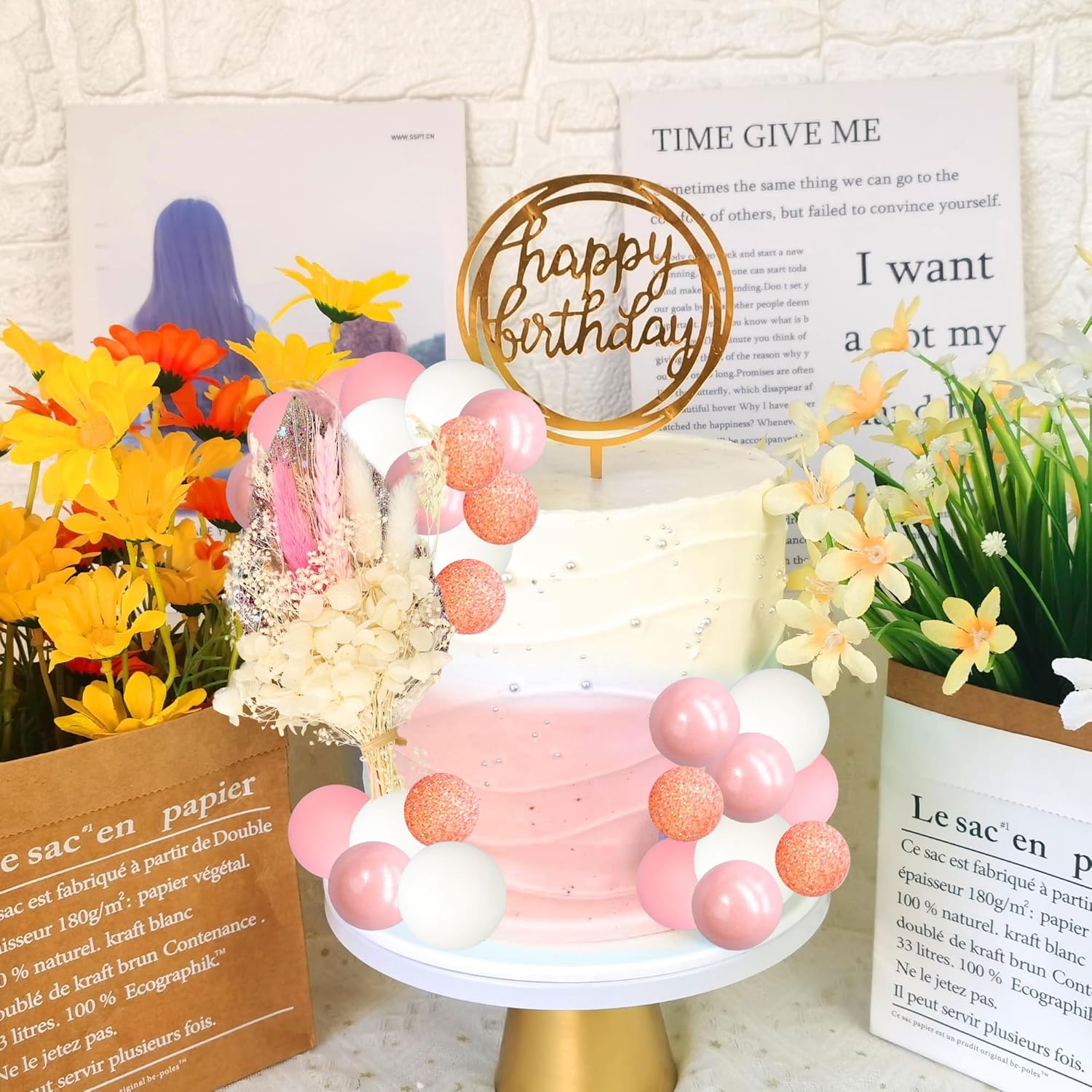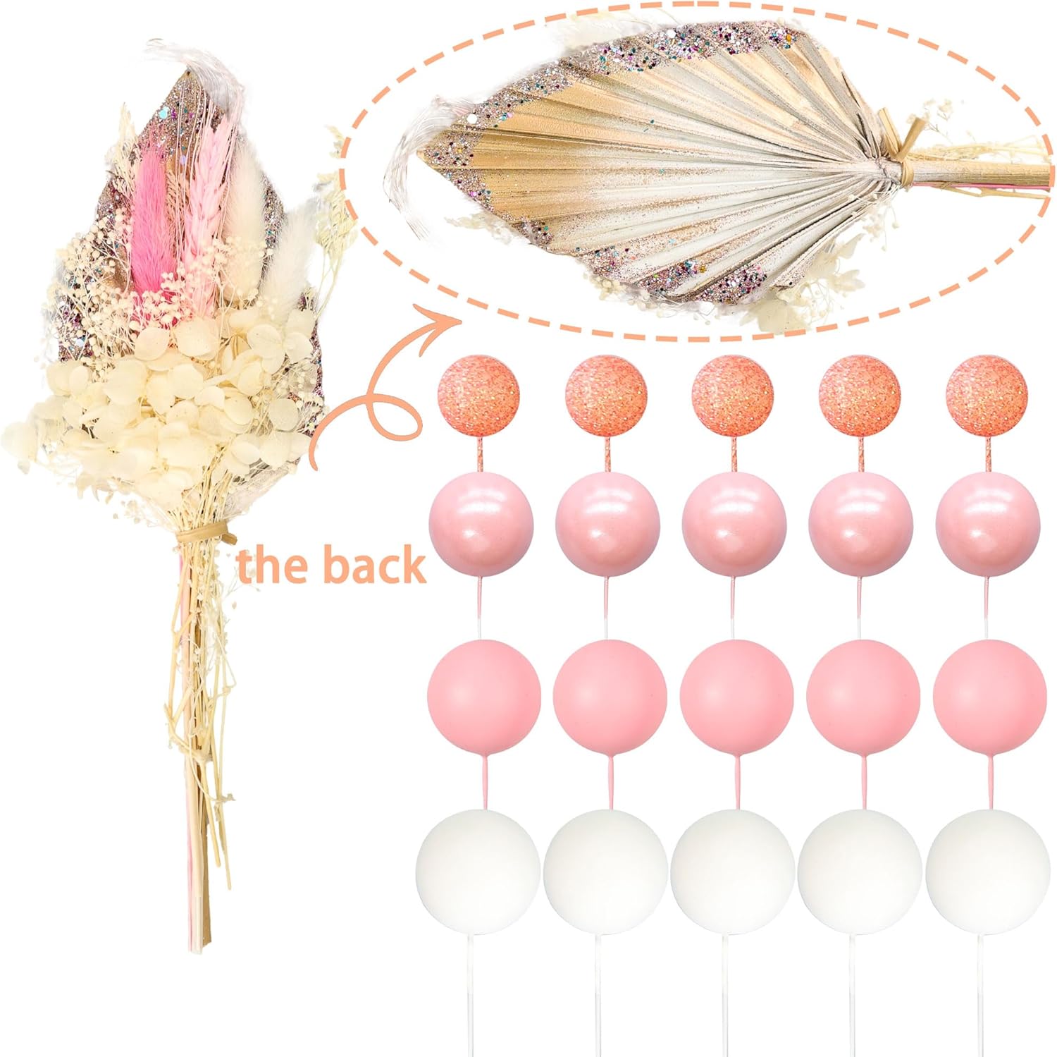 Gyufise 21 Pack Flower Boho Cake Topper Ball Cake Decorations Palm Leaves Plants Cake Decor for Girl Bohemian Princess Theme Wedding Baby Shower Birthday Party Supplies Pink White
