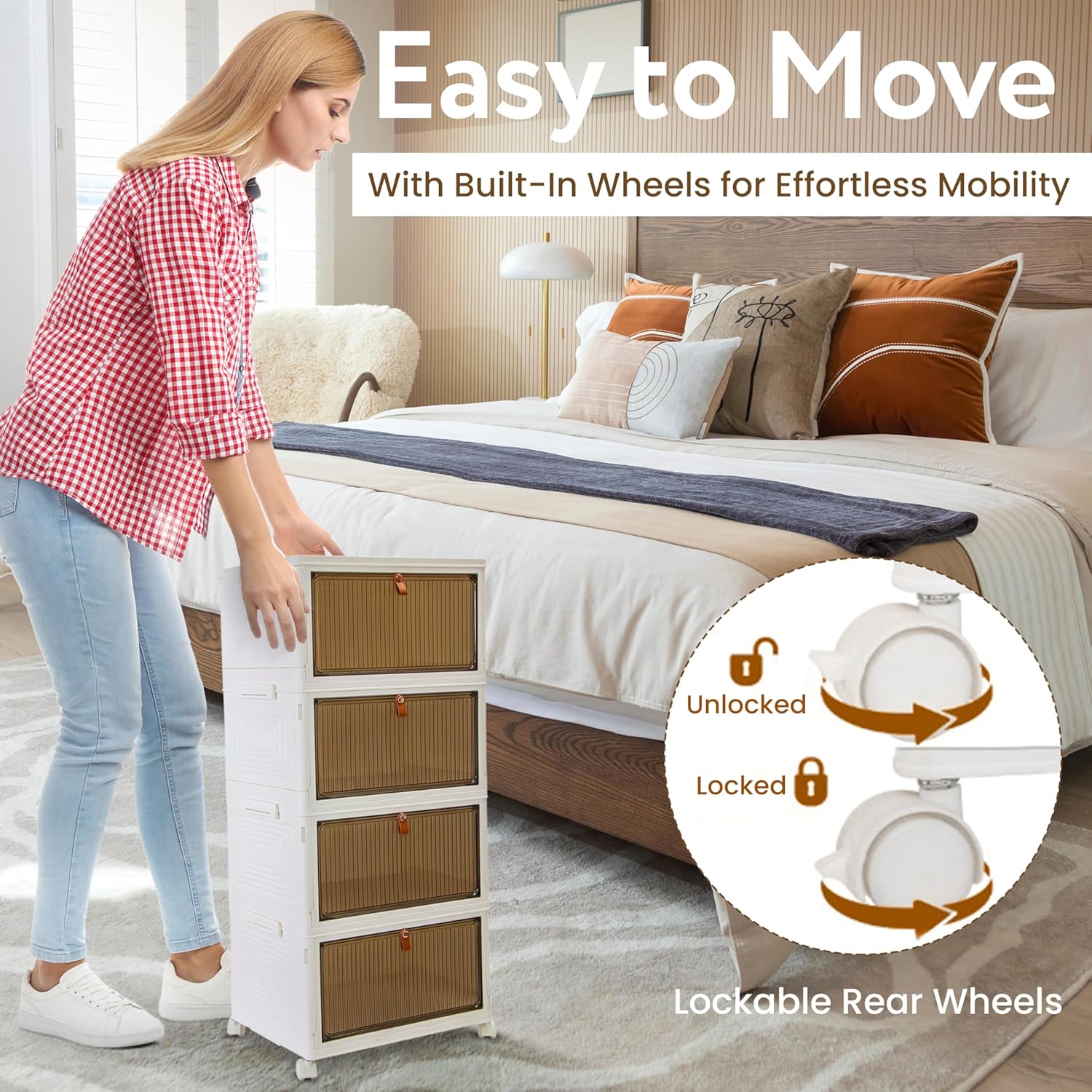 - DURABLE CONSTRUCTION WITH MOBILITY - Heavy-duty plastic frame supports stacked weight while built-in wheels with locking mechanism allow easy repositioning. Lockable wheels ensure stability when stacked. Won't crack, warp, or fade over time.
