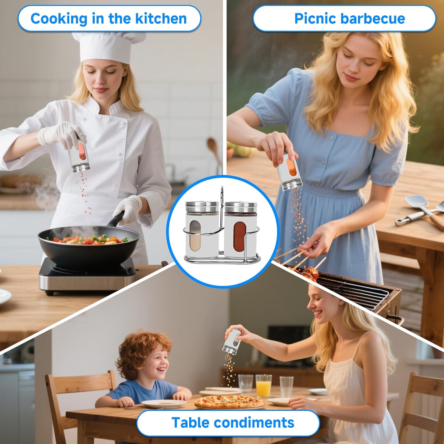 - Made of lead-free glass and stainless steel with adjustable holes for repeated use,With glass viewing ports. the Mini Salt and Pepper Shaker Set comes with an easy spice rack and is perfect for countertop organizers!