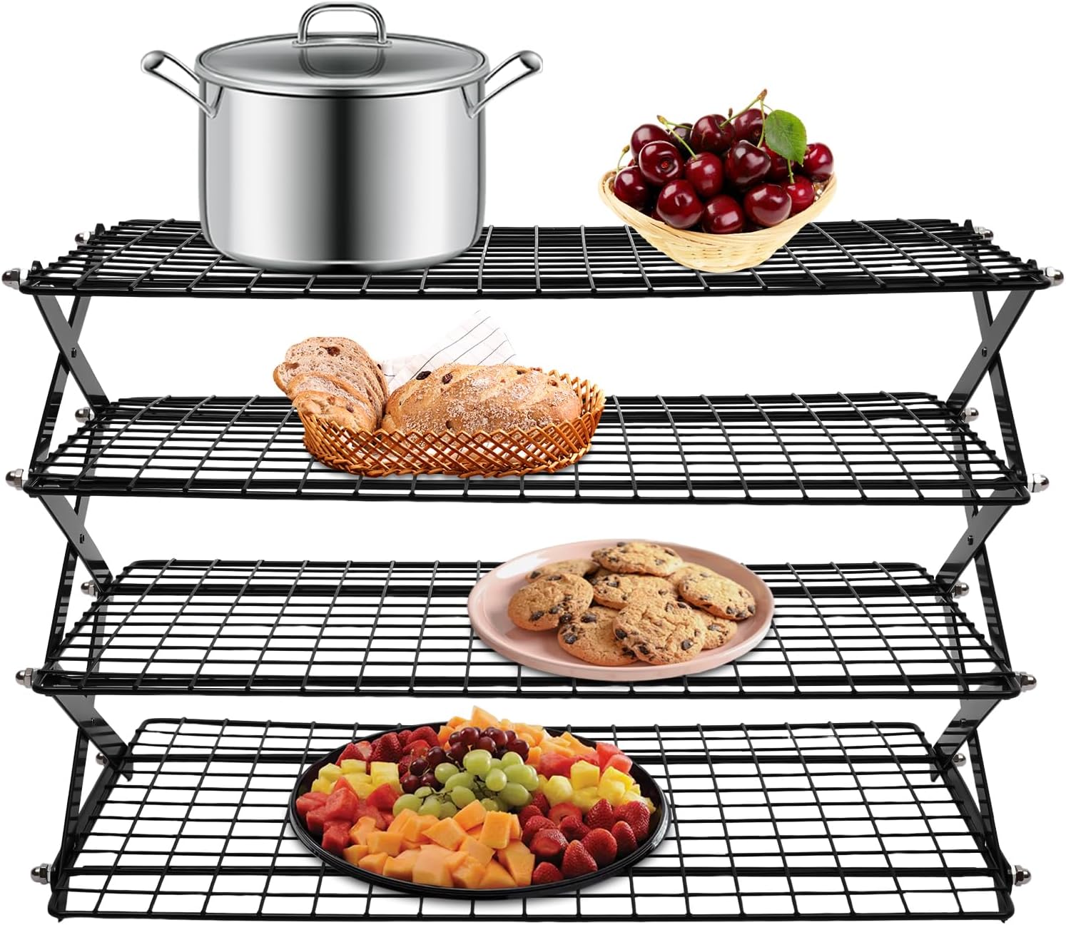 - HOLD MORE WITH 4-TIER STACKABLE DESIGN: Organize your baking or BBQ space with this 4-tier collapsible rack, offering generous room for cookies, meats, utensils, and more. Each tier supports up to 22.05 lbs, keeping essentials elevated and within easy reach.