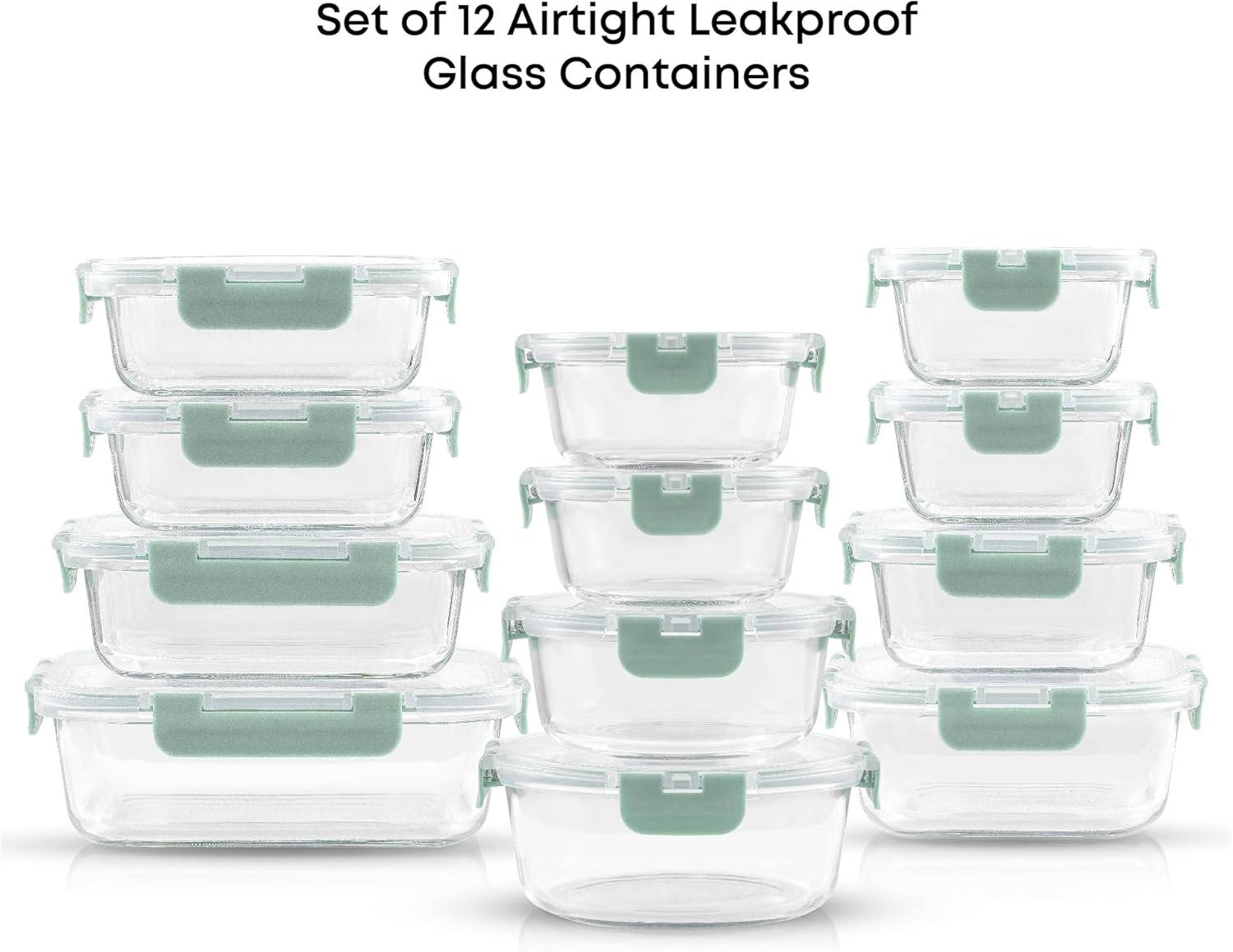 JoyJolt 24pc Borosilicate Glass Storage Containers with Lids | 12 Airtight/Freezer Safe Food Storage Containers for Pantry and Kitchen | Meal Prep Container for Lunch | Glass meal Set