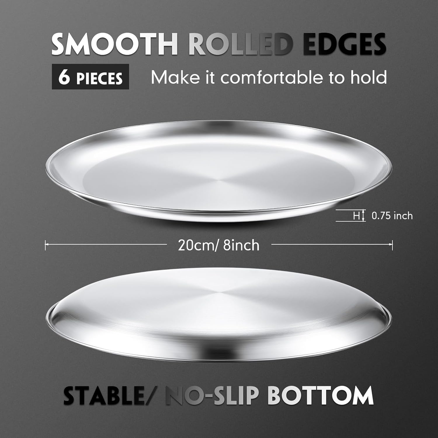 Thenshop 6 Pieces 8 Inch Pizza Pans Bulk Stainless Steel Sets Round Bakeware Pizza Trays for Oven Kitchen Baking Home Restaurant Safe Sturdy Reusable Easy Clean(Silver)