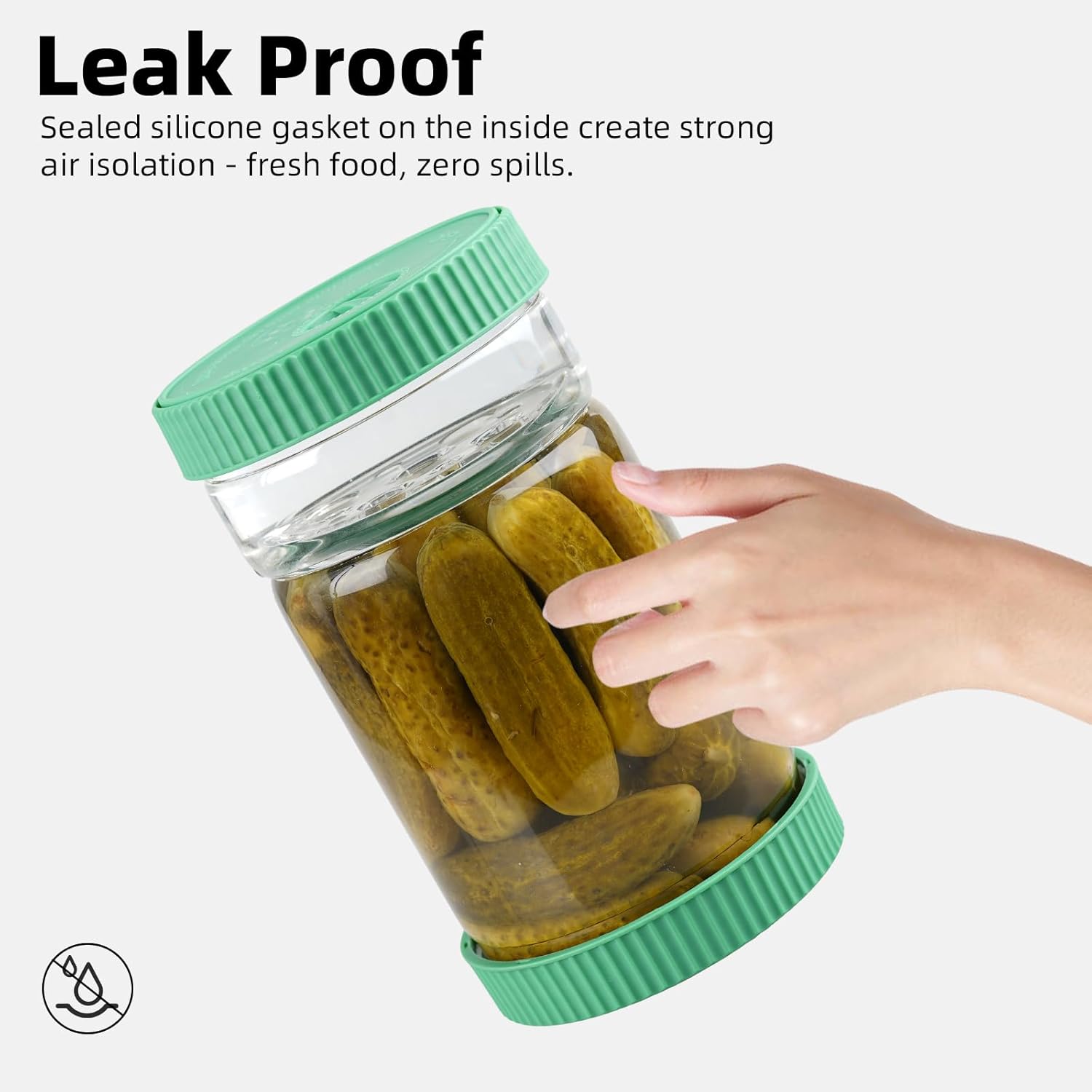 - Glass Strainer & Leakproof: Features an integrated glass strainer, molded into the jar body. Smooth glass strainer resists odors and minimizes residue buildup. Our pickle jars feature a dual design of threaded lids + silicone sealing ring to prevent leakage during turning or refrigerator storage. 4-inch wide mouth allows effortless loading of jalapeños, olives, and cherry tomatoes. Make sure the lids are aligned and tightly closed before turning