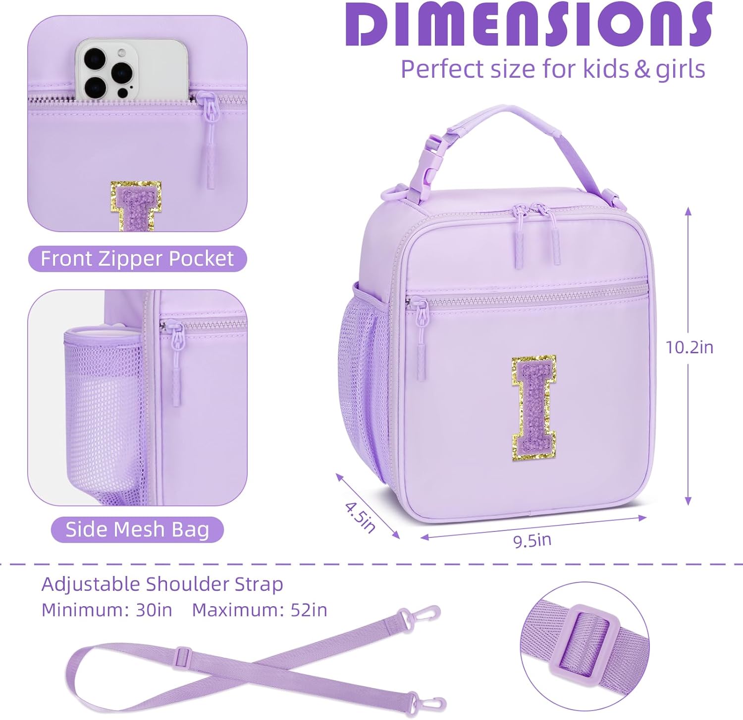 Initial Insulated Lunch Bag for Girls Kids, Back to School Gift, Reusable Leak-proof Lunch Box with Adjustable Strap for School Daycare Travel Picnic (Purple,I)