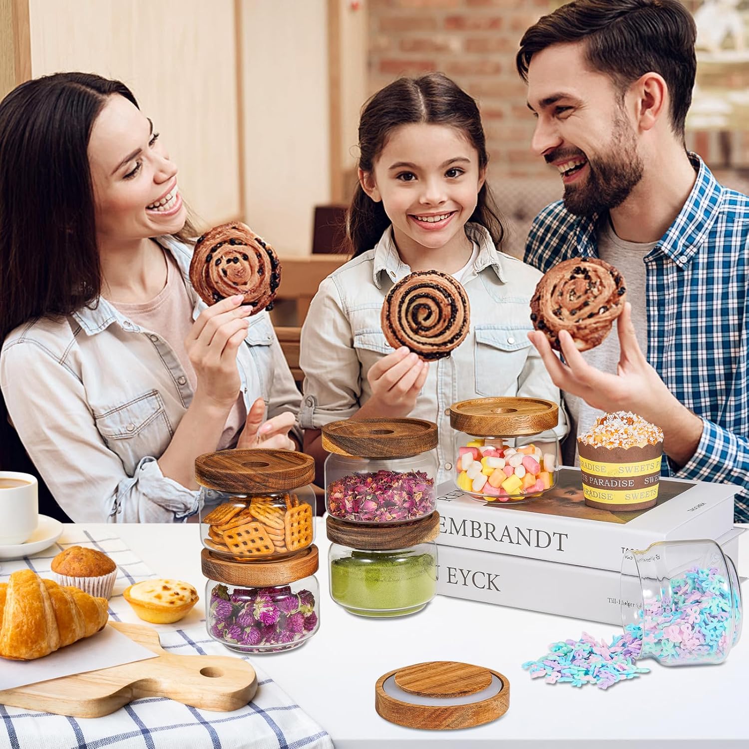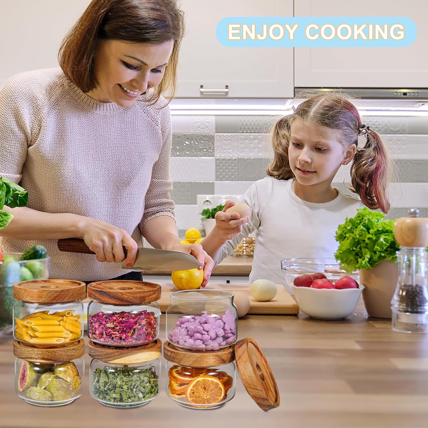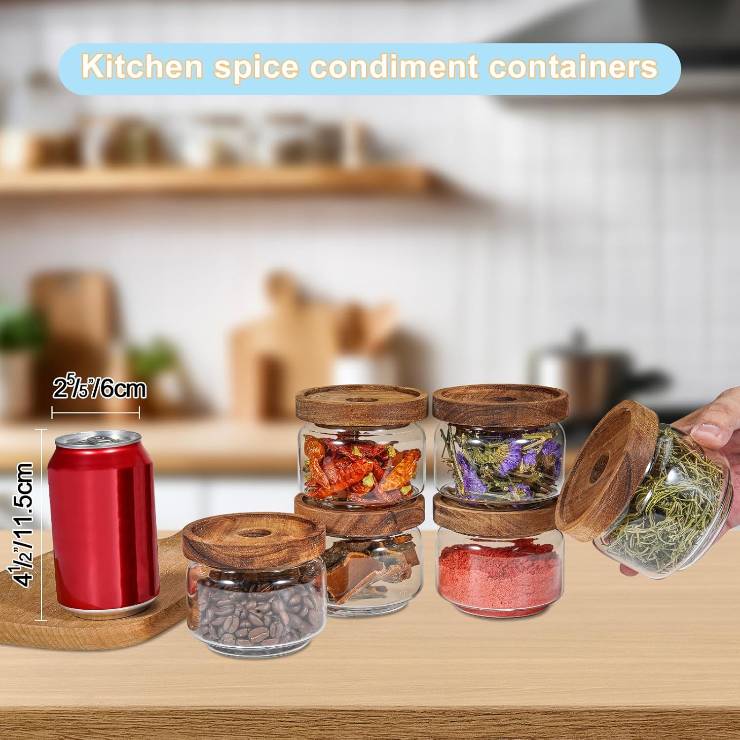 - - 【WIDE APPLICATIONS】 Small glass canisters for pantry organization are suitable for storing various dried ingredients to retain their freshness, with clear glass jars, you can easily see inside and quickly find the ingredients you need.Glass jars with wood lids perfect for storing dry food , such as,cookies,dried beans,pepper, oatmeal,jams, chutneys, rice, flour, tea, coffee, biscuits, candy,cheese,flour, sugar, seeds,etc. Keep your kitchen tidy and safe,saving space and convenient .