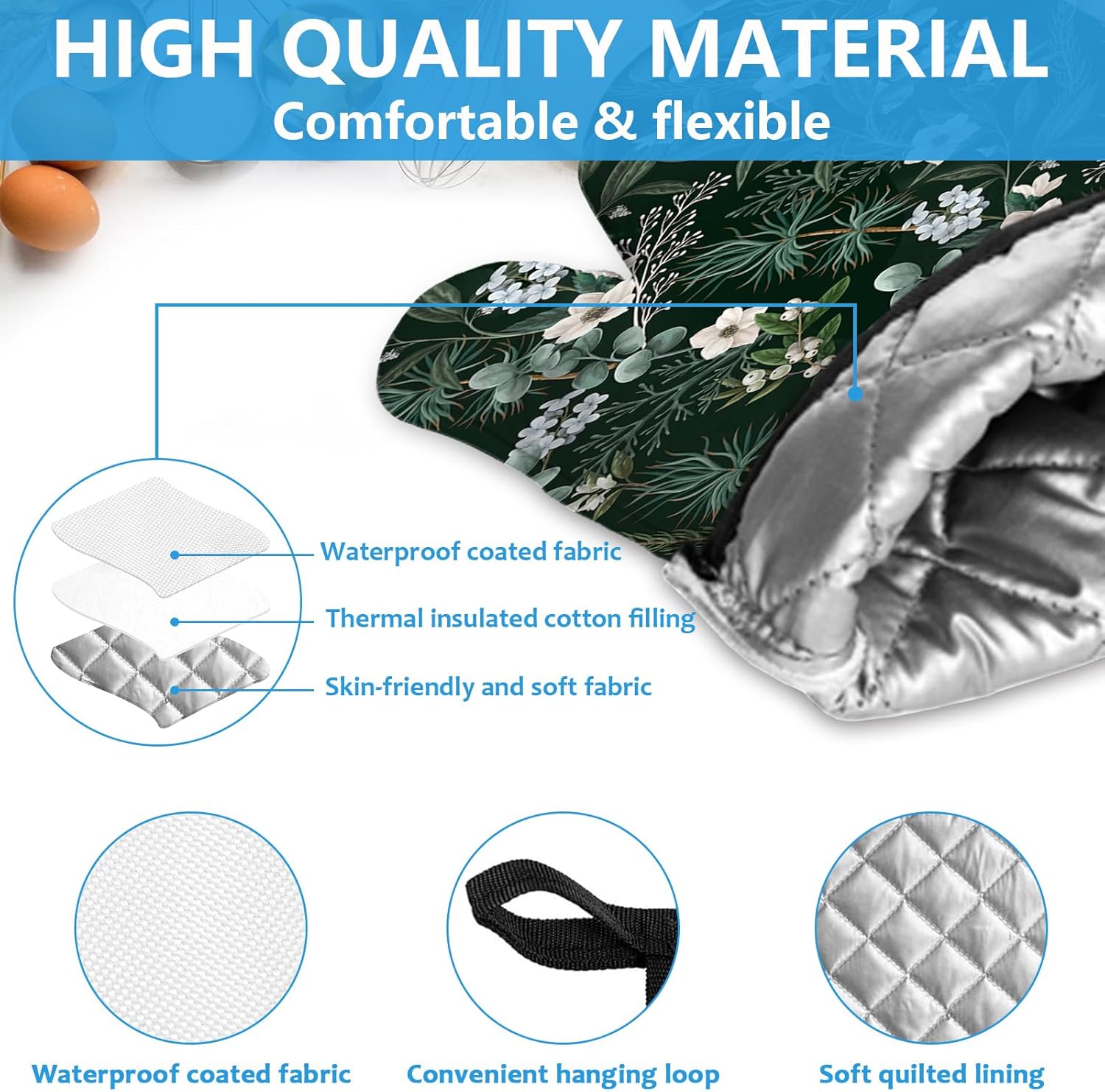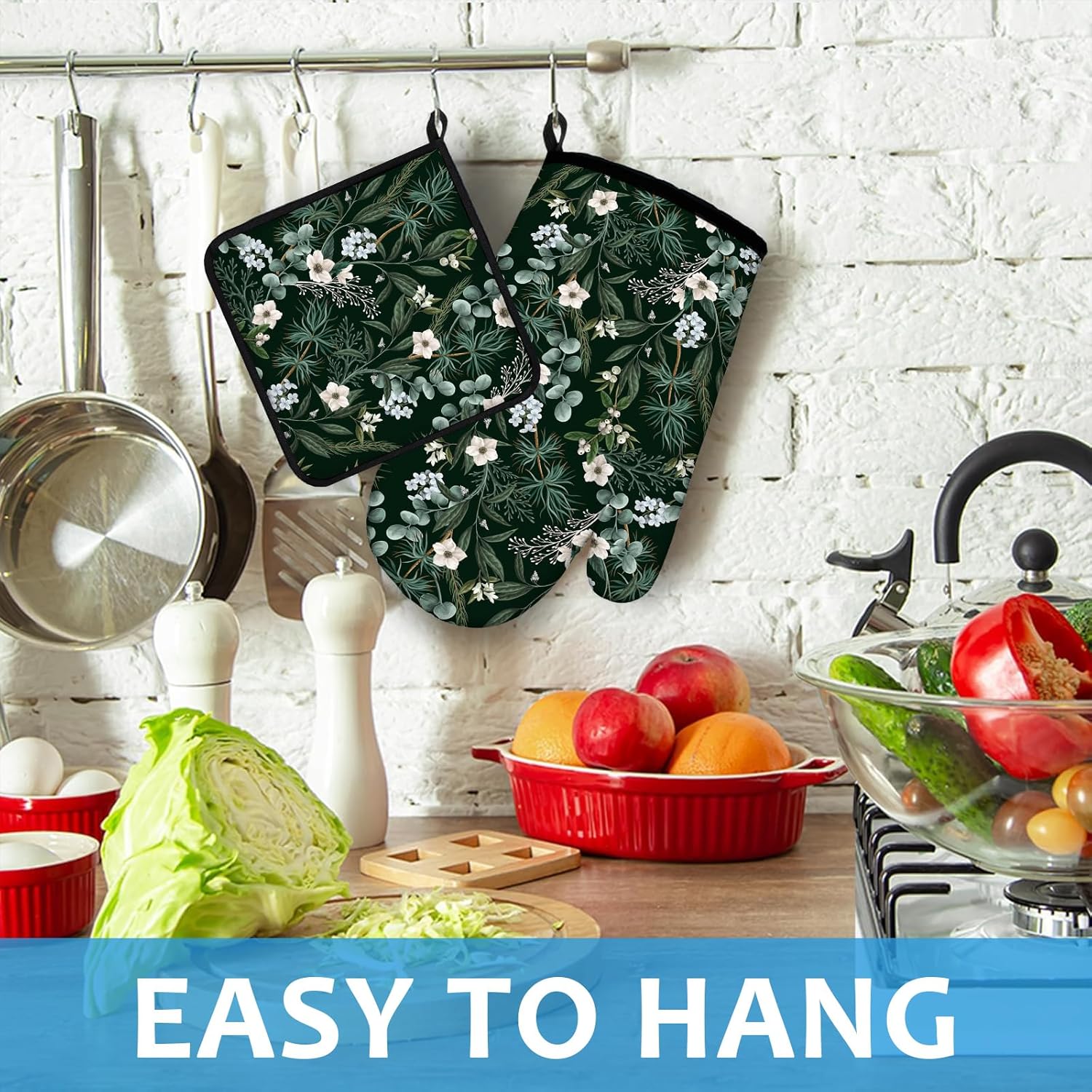 Botanical Print FloralOven Mitts and Pot Holders Sets Heat Resistant 4Pcs Potholders Oven Gloves Hot Pads for Kitchen Baking Cooking Grilling BBQ