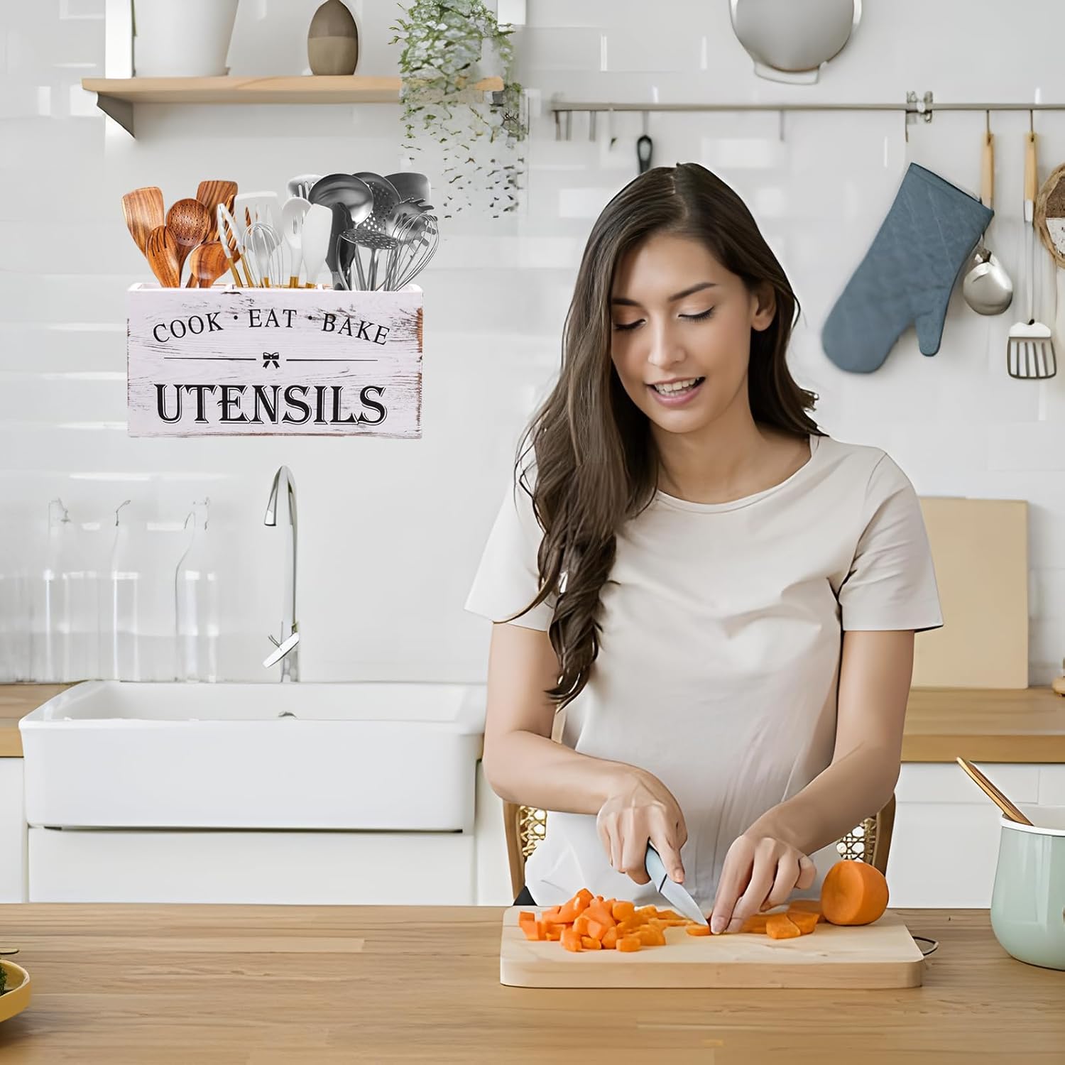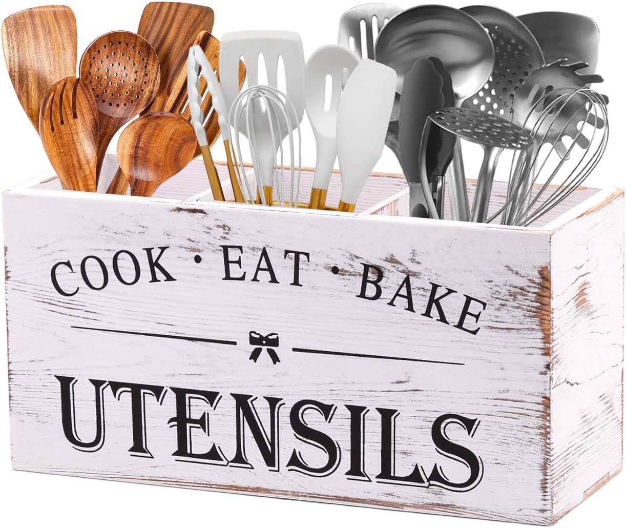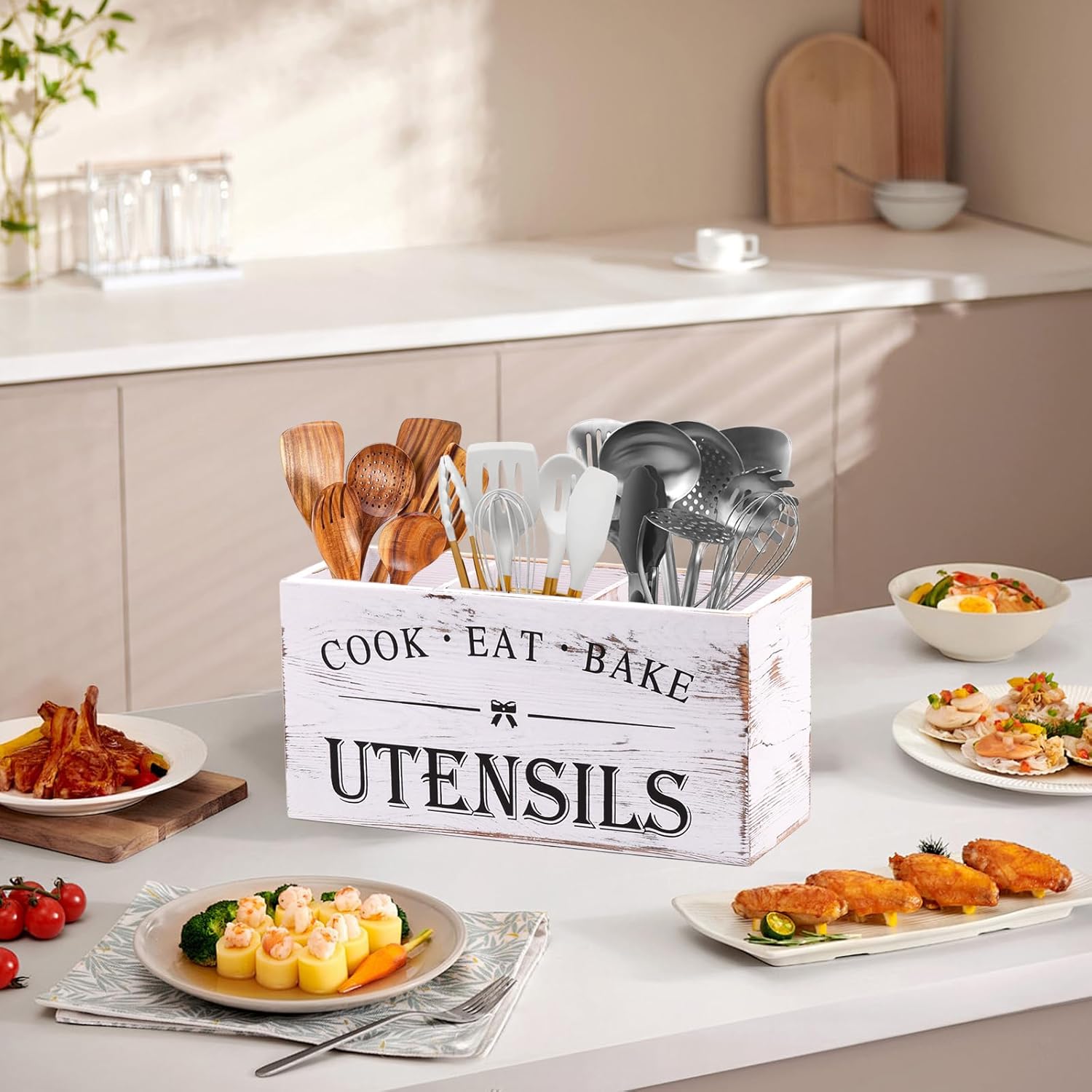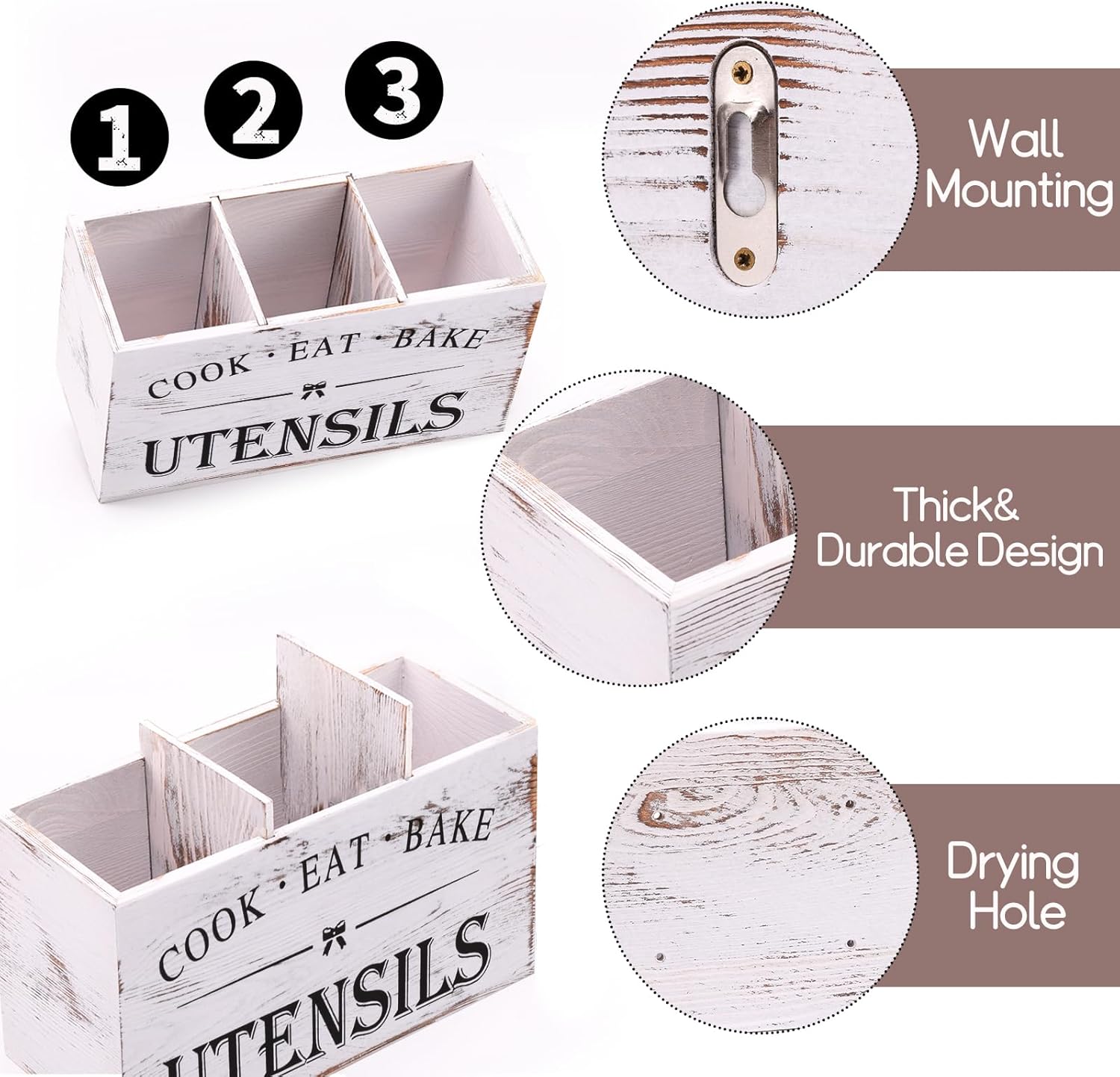 - Farmhouse Wooden Utensil Holder:Our kitchen utensil holder with 3 compartments to neatly separate spatulas, spoons, whisks, and other cooking tools—so everything stays organized and ready to use. No more digging through cluttered drawers!
