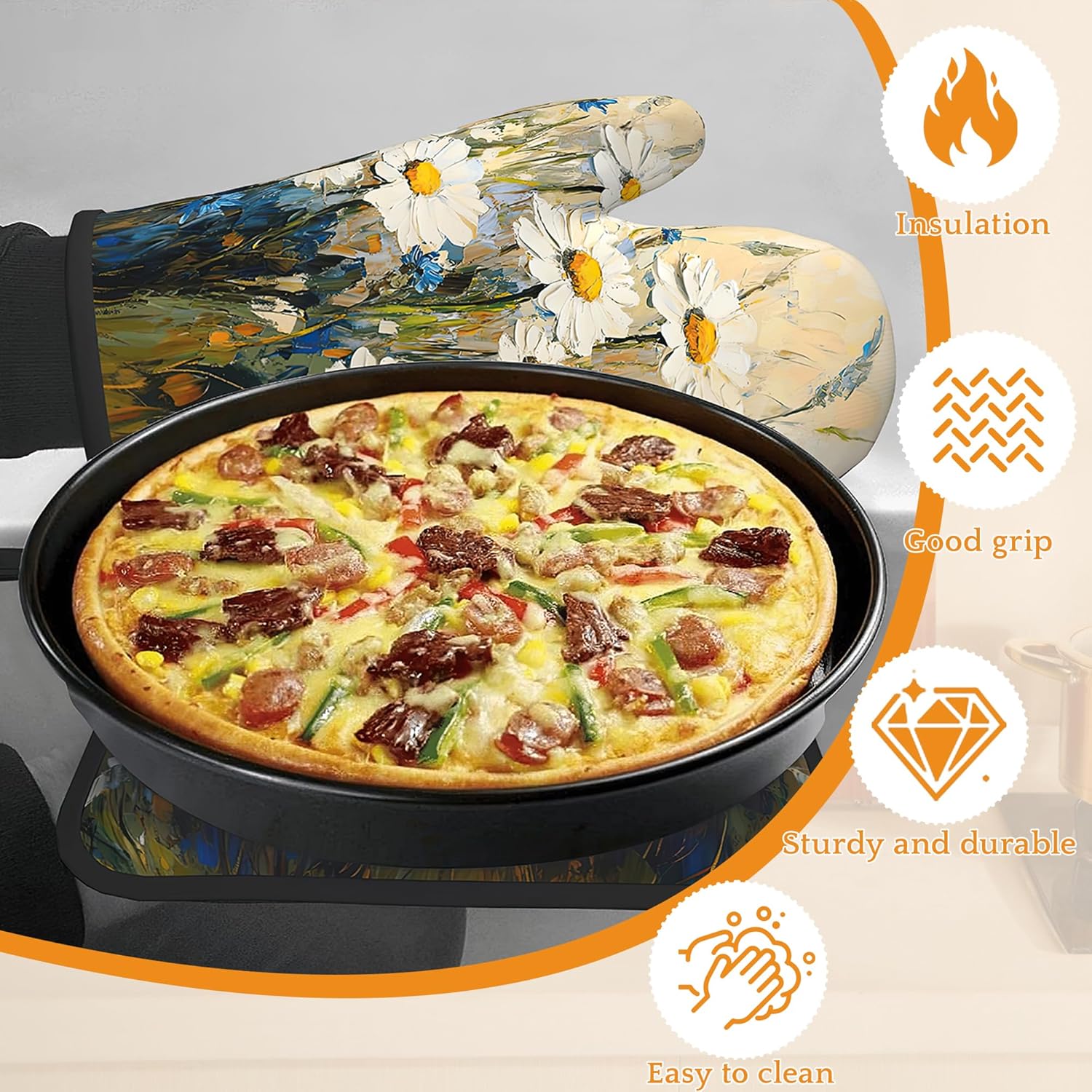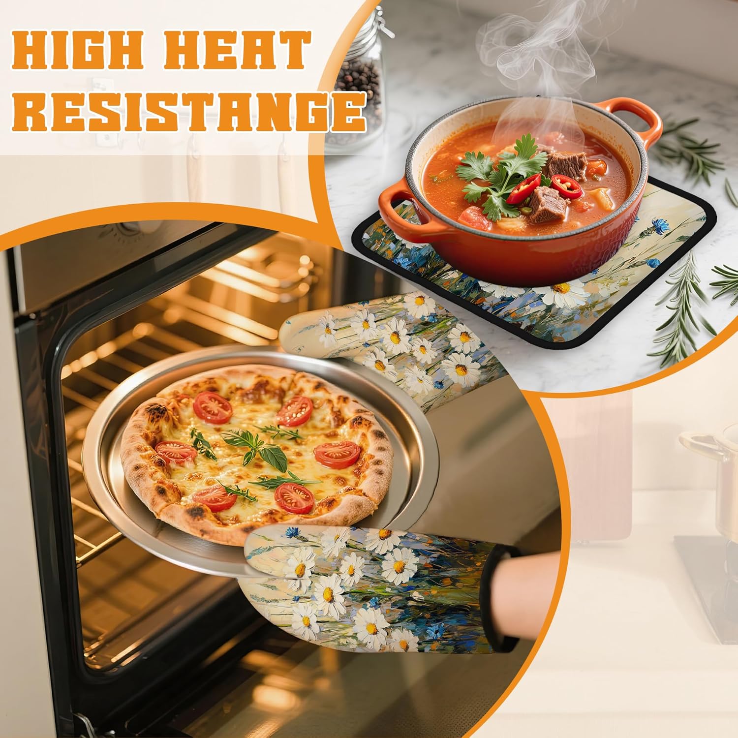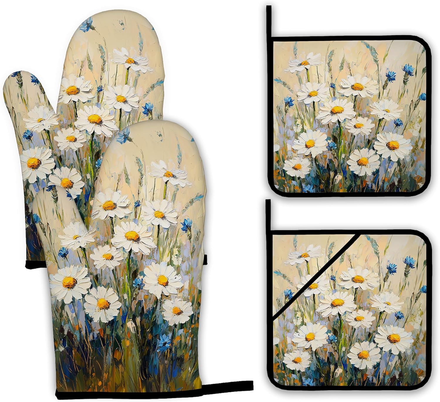 Vintage Daisy Flower Oven Mitts and Pot Holders,Heat Resistant Oven Mitts Gloves and Pot Holder for Home Kitchen Decorations Cooking Baking BBQ Gifts,Set of 4