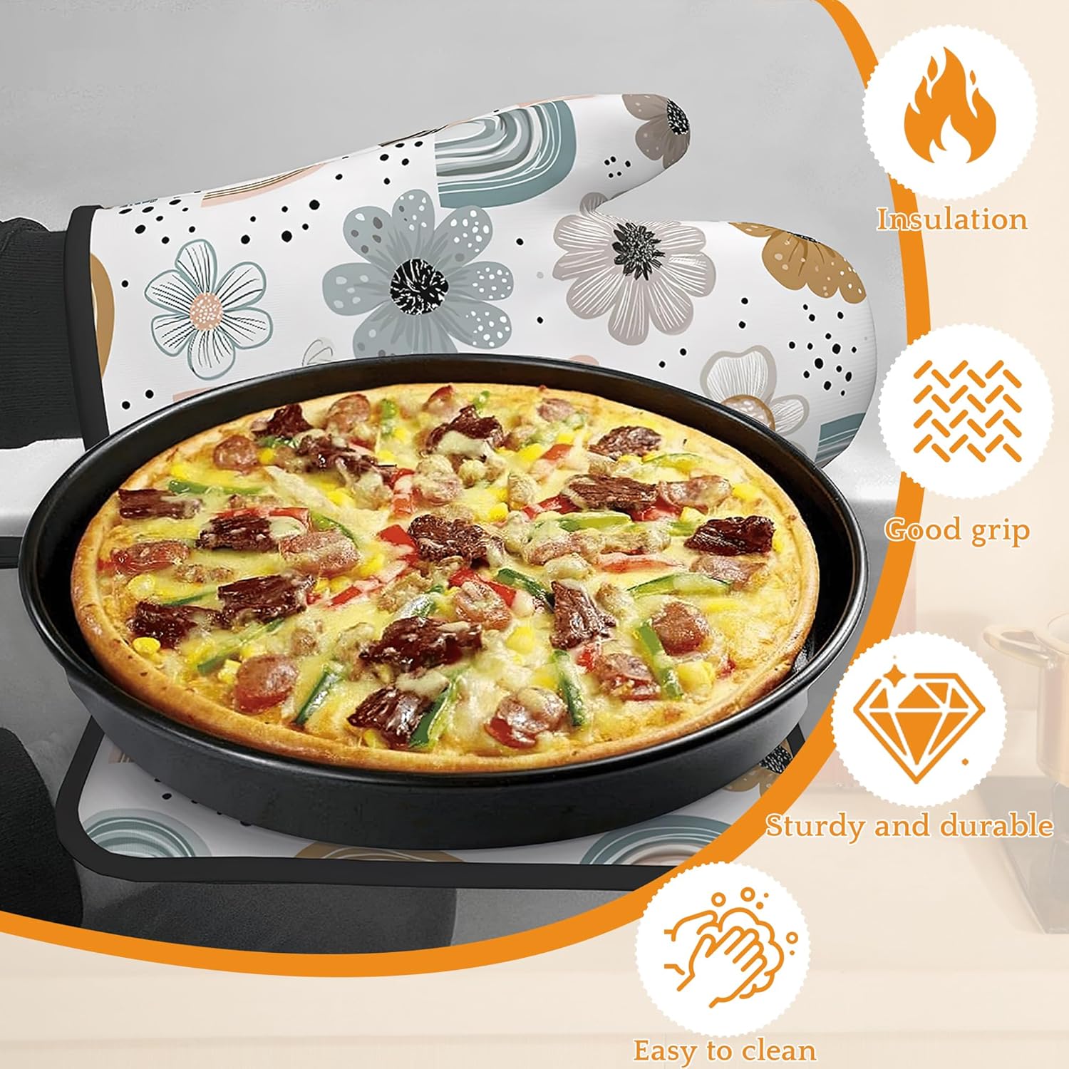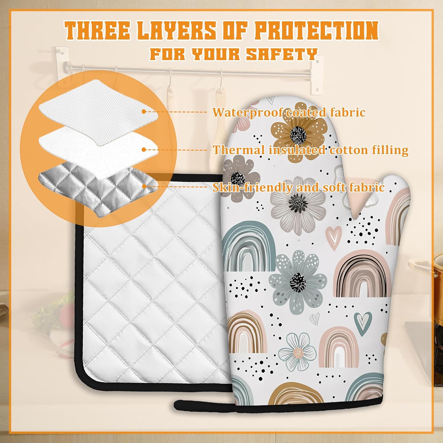 Cute Rainbows Oven Mitts and Pot Holders,Boho Floral Flowers Heat Resistant Oven Mitts Gloves and Pot Holder for Home Kitchen Decorations Cooking Baking BBQ Gifts,Set of 4