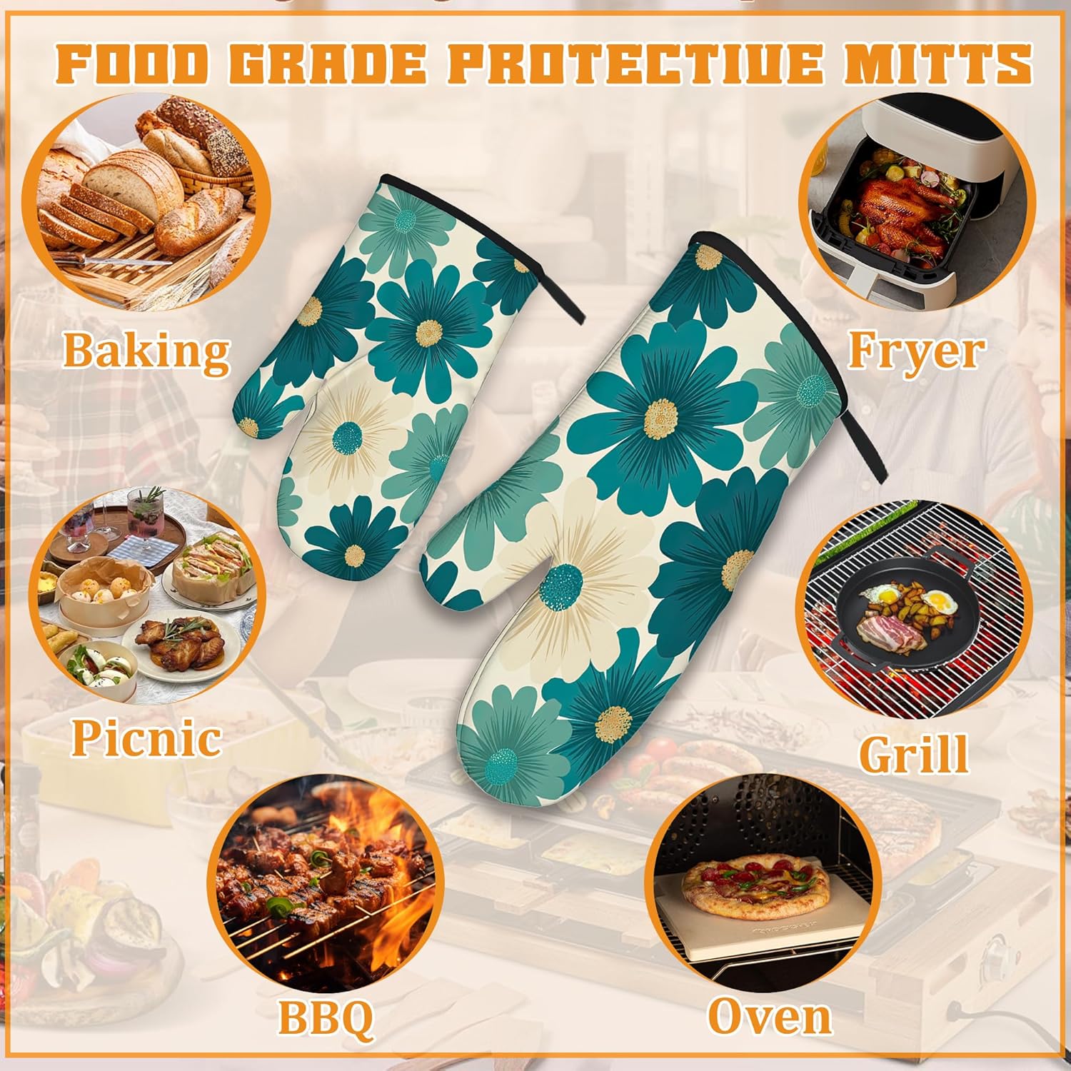 Abstract Daisy Flower Oven Mitts and Pot Holders,Retro Groovy Flowers Heat Resistant Oven Mitts Gloves and Pot Holder for Home Kitchen Decorations Cooking Baking BBQ Gifts,Set of 4