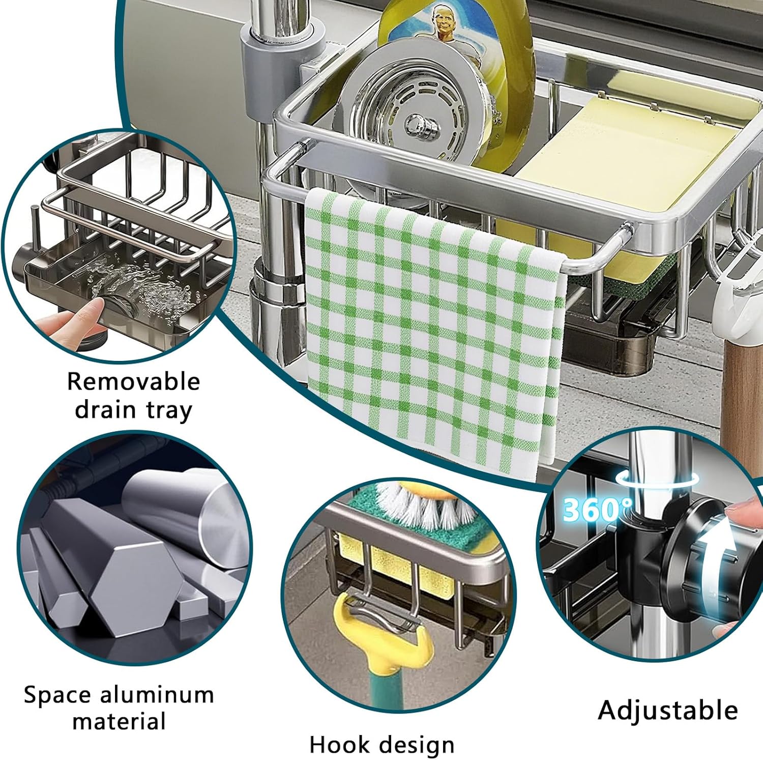 - 🧽【Multifunctional Sink Faucet Organizer】Keep your sponge, scrubber, dish soap, and brush within reach with this over-the-faucet kitchen sink caddy. Ideal for maximizing your sink space.
