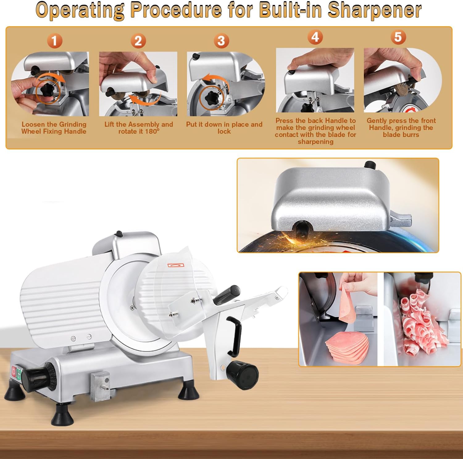 - Premium Materials for Superior Durability: This commercial meat slicer boasts a die-cast aluminum body and 12-inch carbon steel blade. Made with high-quality materials, it delivers strong rust and corrosion resistance. The blade stays exceptionally sharp for faster, more efficient cutting—ensuring long-term stable performance. (Note: The meat slicer produces operational noise, with a sound level below 55 decibels.)