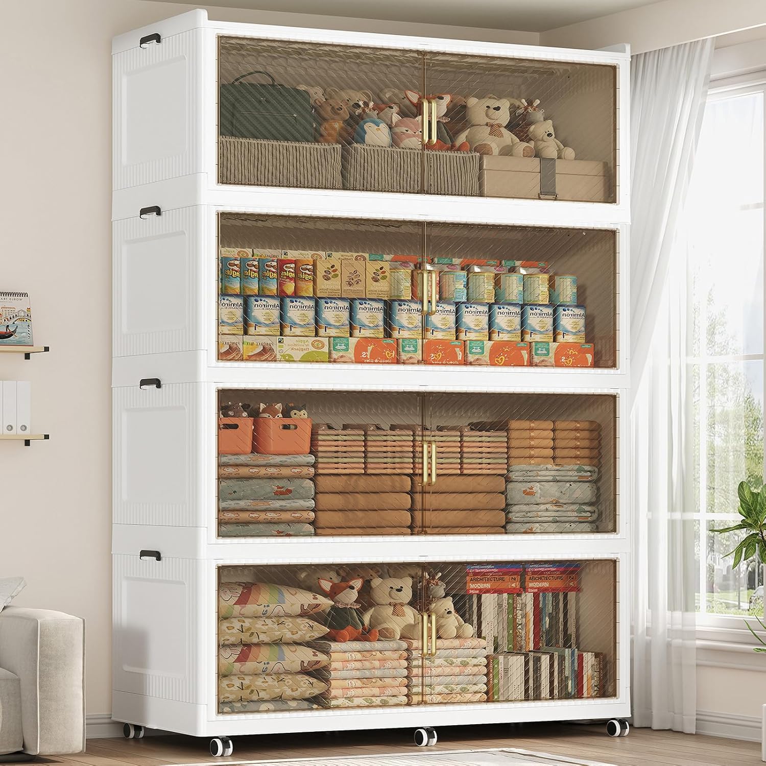 - 【Two Ways to Open & Magnetic Doors】The collapsible storage bins with lids and wheels feature a dual access way, allowing for both top and front door openings, and with clear brown windows for easy visibility. The super huge storage bins with open front doors are equipped with magnetic lock buckles to prevent dust from entering the cabinet.