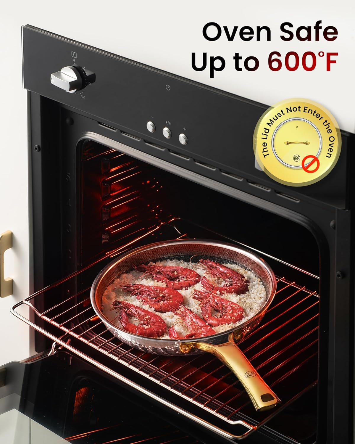 Gold Pots and Pans Set, Hybrid Hammered Stainless Steel, 10PC Nonstick Kitchen Cookware Sets w/Frying pan, Non Toxic, Oven Safe & Compatible with All Stovetops