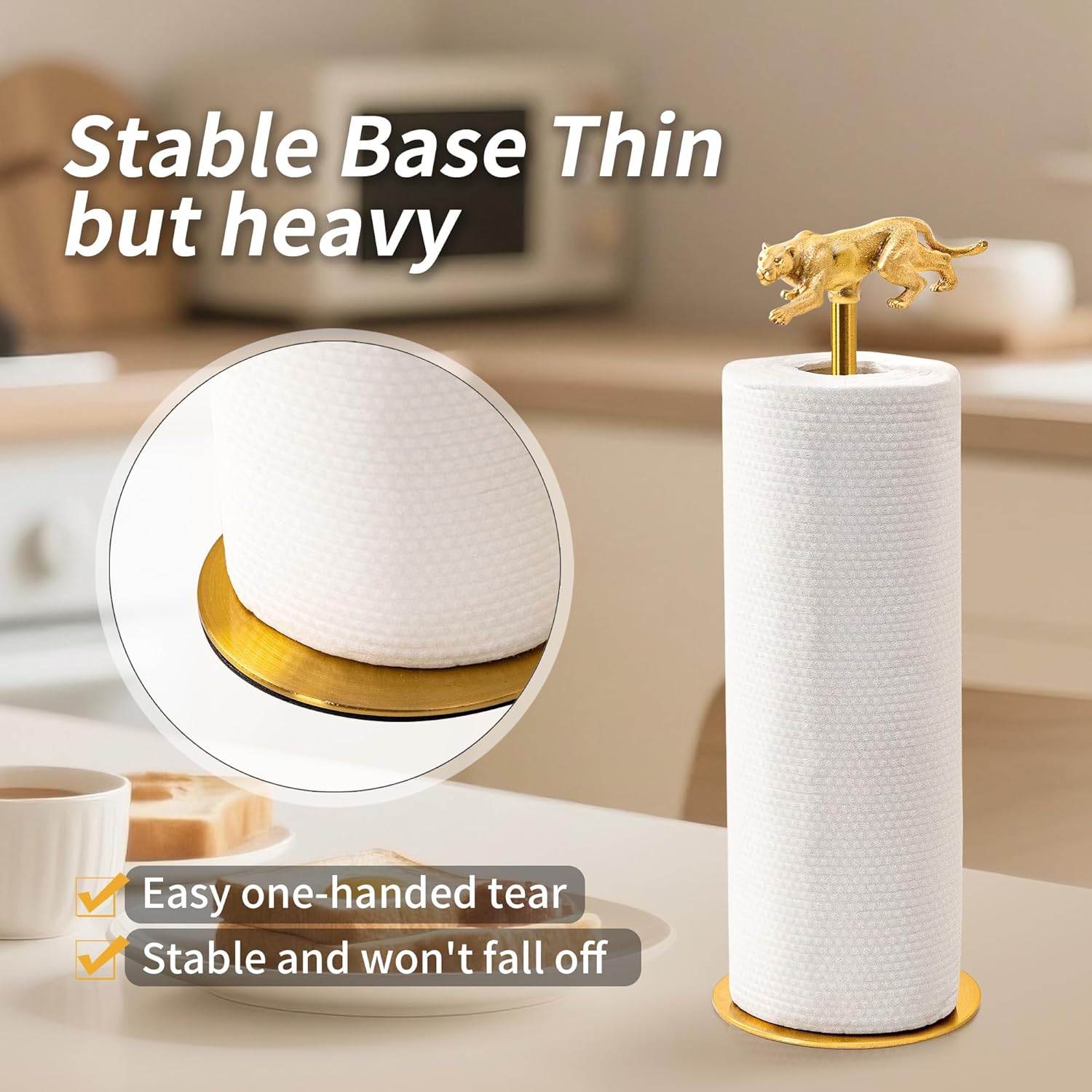 - Elegant and Functional Design: Designed with a charming Leopard motif and a vintage brass finish, this paper towel holder combines practicality with artistry. Its compact, freestanding structure fits seamlessly on any countertop, offering easy access to paper towels while enhancing your home’ s decor. Ideal as a kitchen towel holder or bathroom paper towel holder.