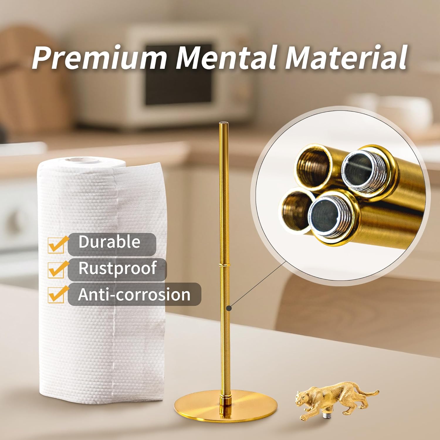- Premium Brass Material & Craftsmanship: This exquisite gold paper towel holder is crafted from high-quality brass, featuring a removable brass Leopard on top. Hand-polished and glazed for a durable, tarnish-resistant finish, it ensures long-lasting beauty. As a decorative paper towel holder, it adds a touch of elegance to your kitchen or bathroom, making it a perfect housewarming gift.