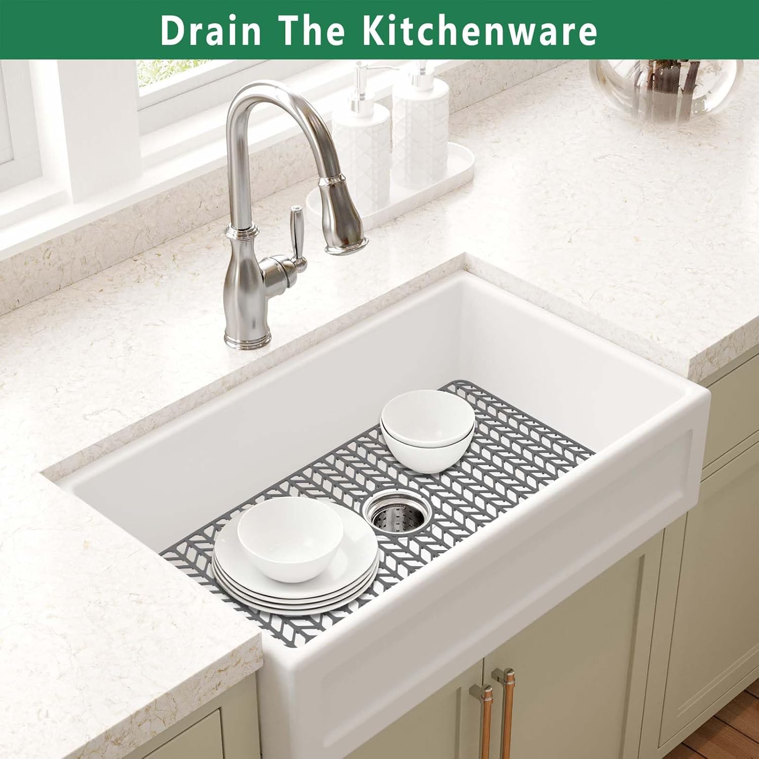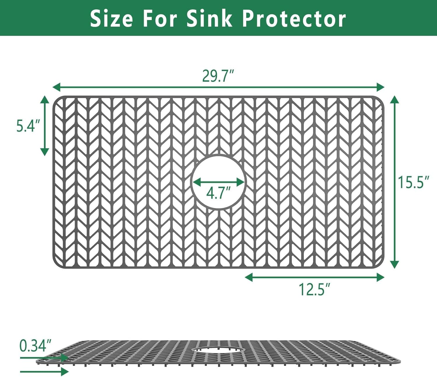 GUUKIN Sink Protectors for Kitchen Mat - 30"x 16" Silicone Kitchen Sink Mat Grid for Bottom of Farmhouse Stainless Steel Porcelain with Center Drain(Grey)